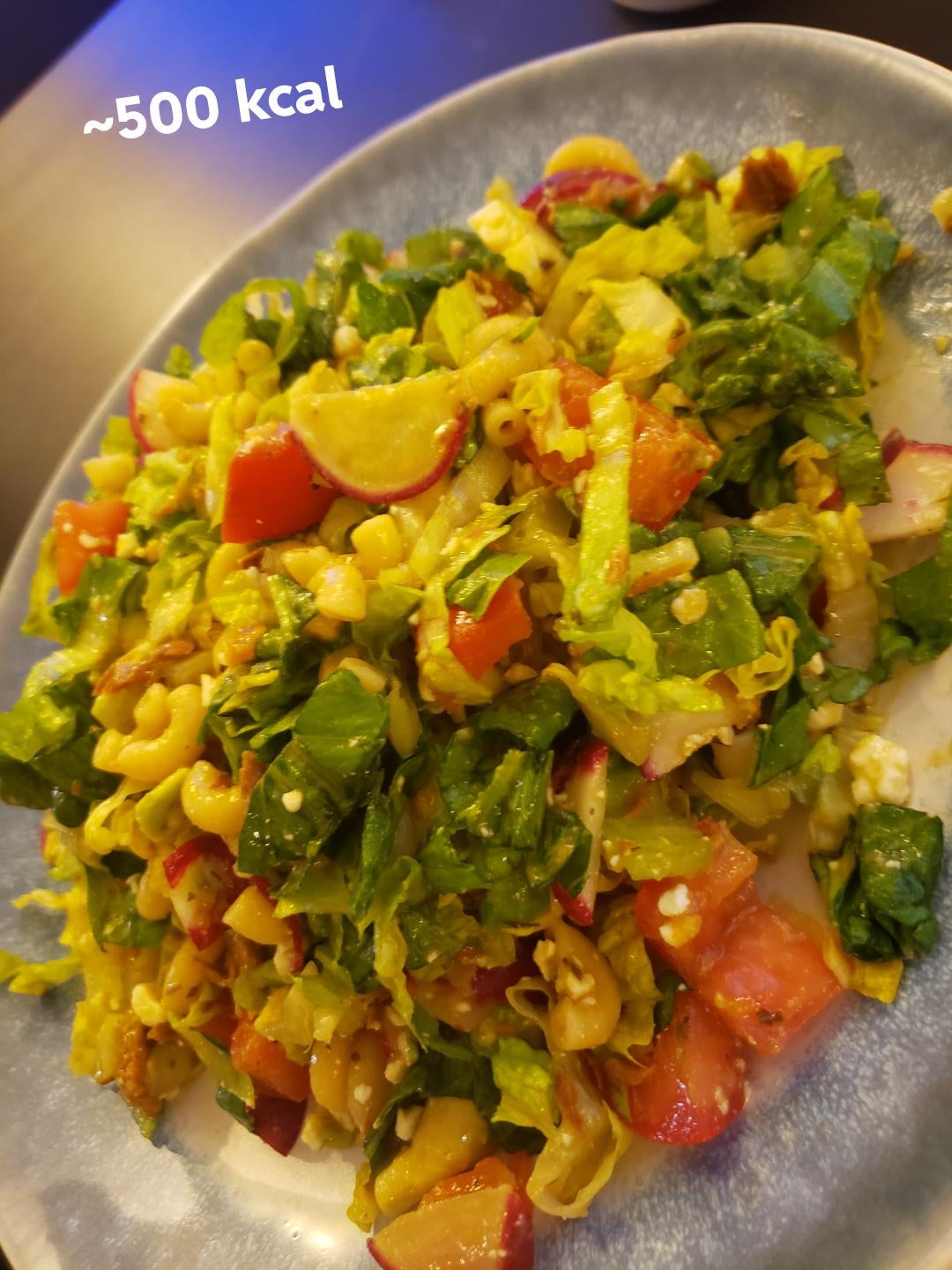 My giant pasta salad for 500 calories. Feta, Tuna, Macaroni, Radishes etc. I made a home made lemon vinaigrette for it too!
