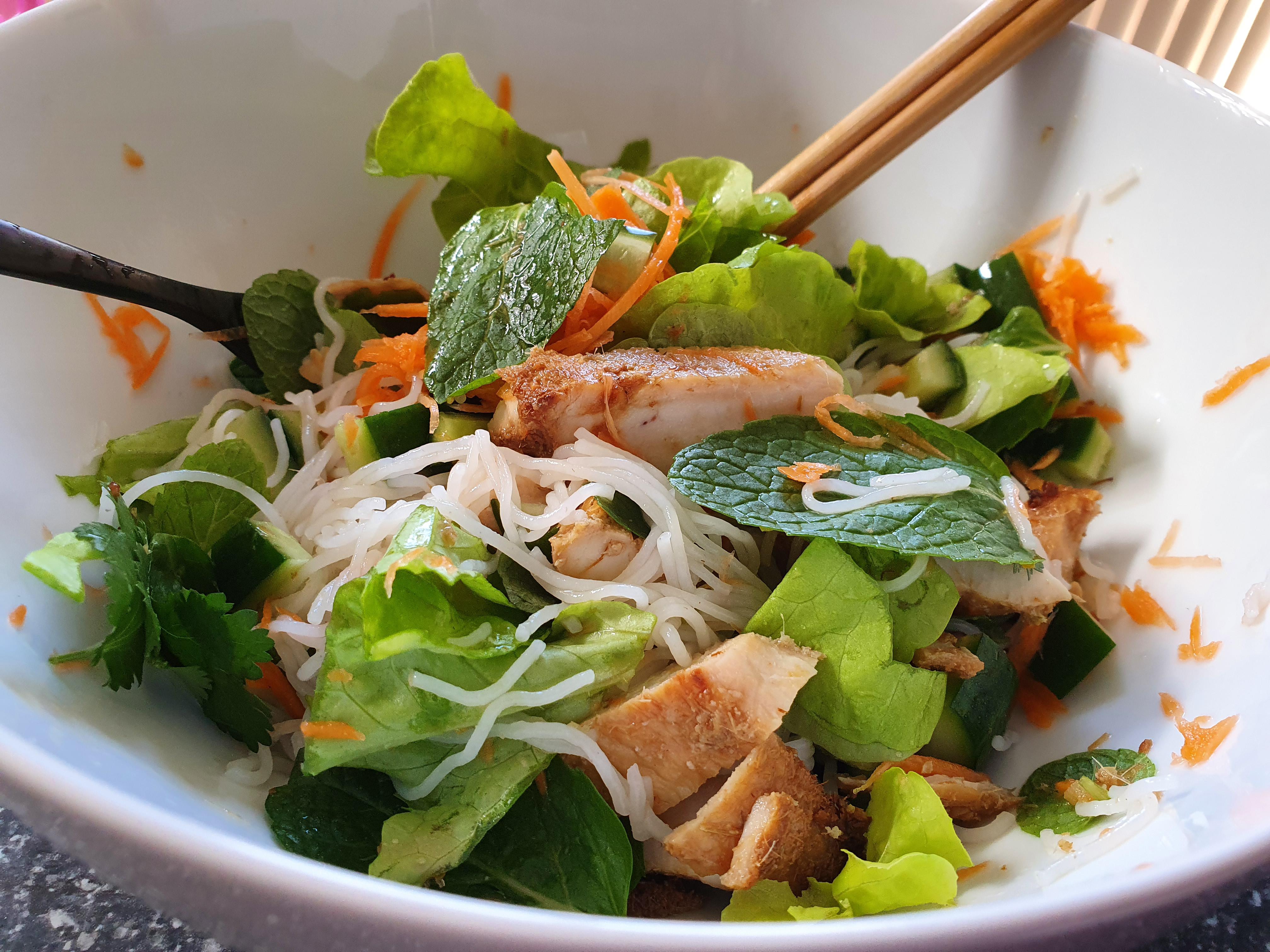 Vietnamese Noodle salad with lemongrass chicken and nuoc cham – 492 calories
