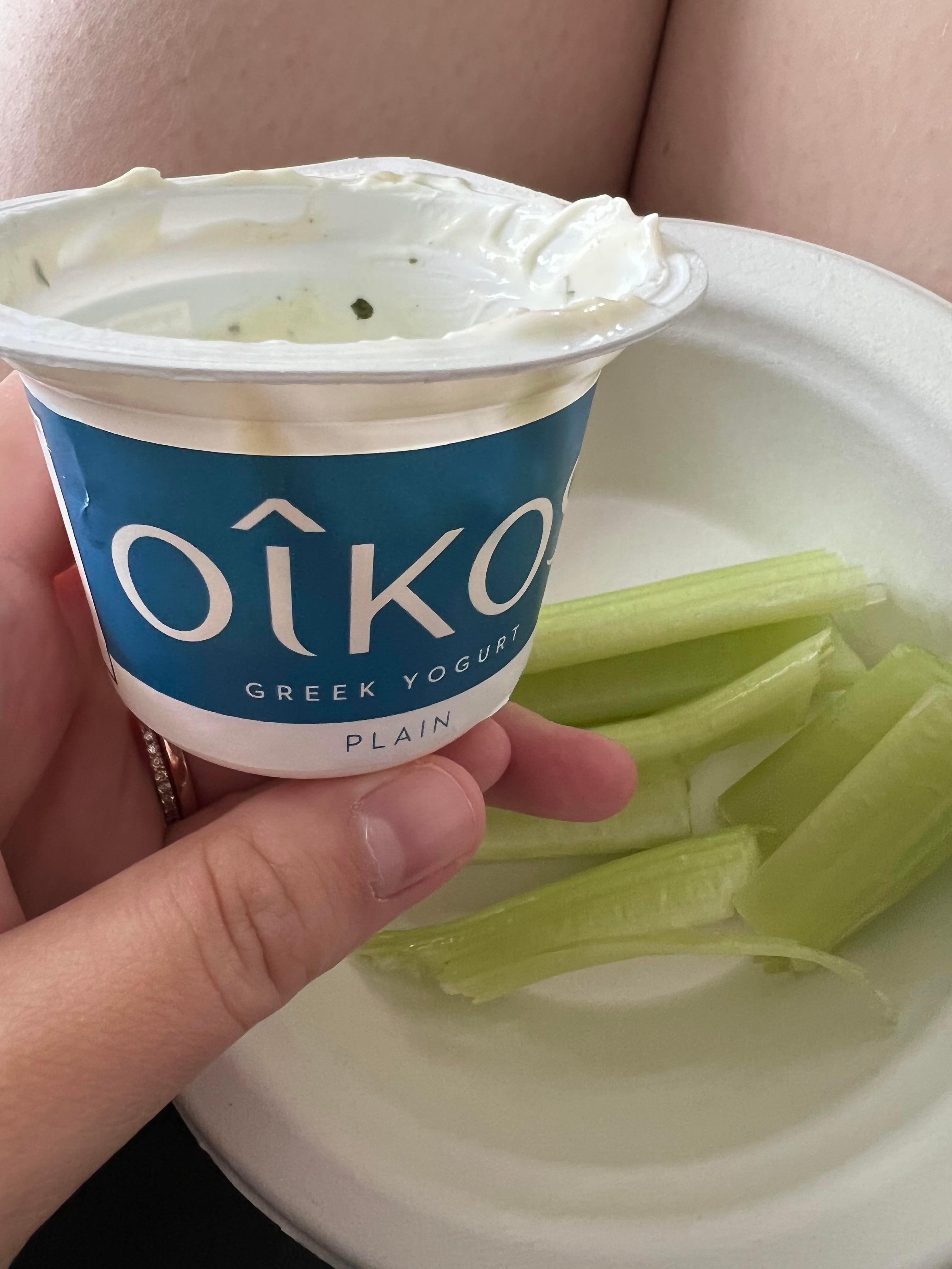 100 calories, 10 grams of protein (Greek yogurt with ranch seasoning)