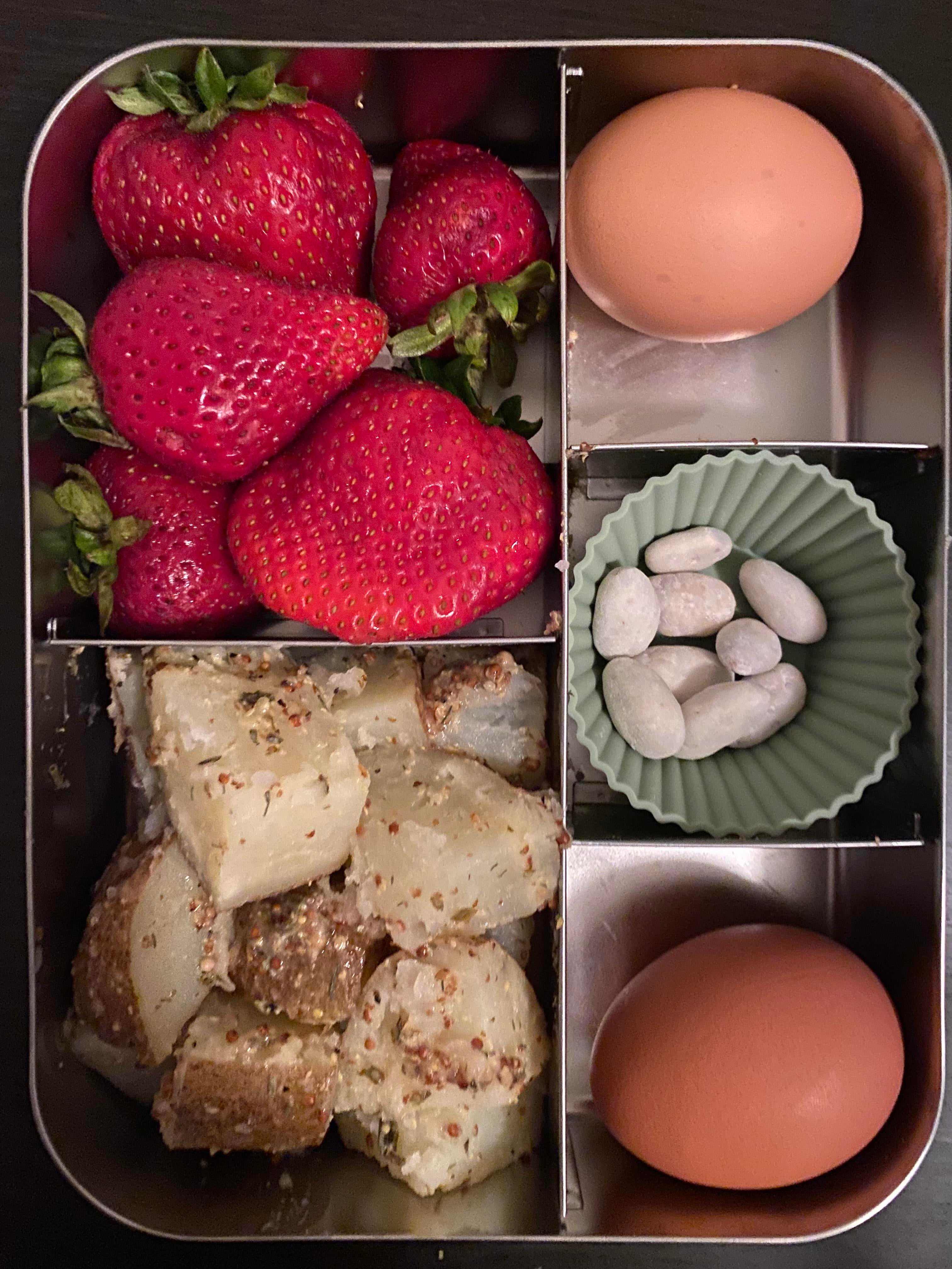 Tomorrow’s lunch bento: strawberries, French potato salad, hard boiled eggs, Skinny Dipped lemon bliss almonds. 507 cal Dining and Cooking
