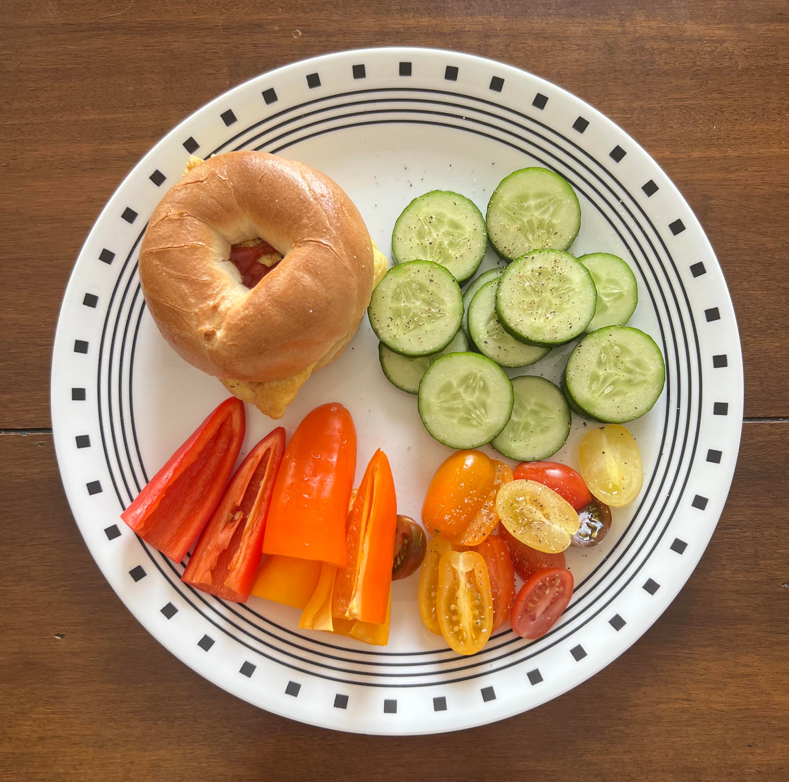 Breakfast: Mini Egg and Cheese Bagel and Veggies. 323 Calories and Delicious 😊