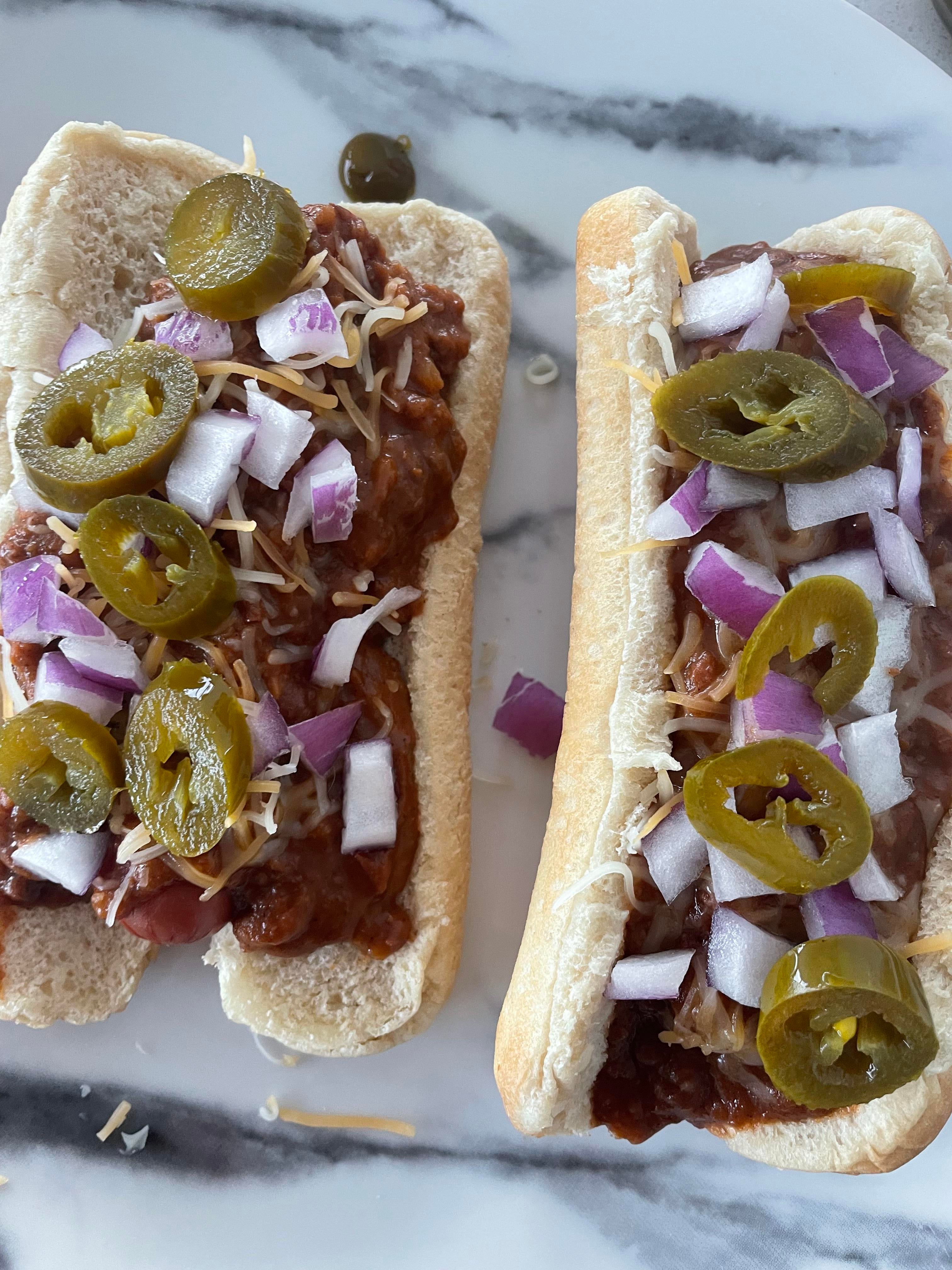 Under 400 calories!! Hot dog buns 45 cals each, turkey dogs 100 Cals each, 40 cals of chili sauce on each dog, jalapeños less than 5 cals, onions less than 5 cals each, 4 grams of low fat cheese on each is 13 cals each!!
