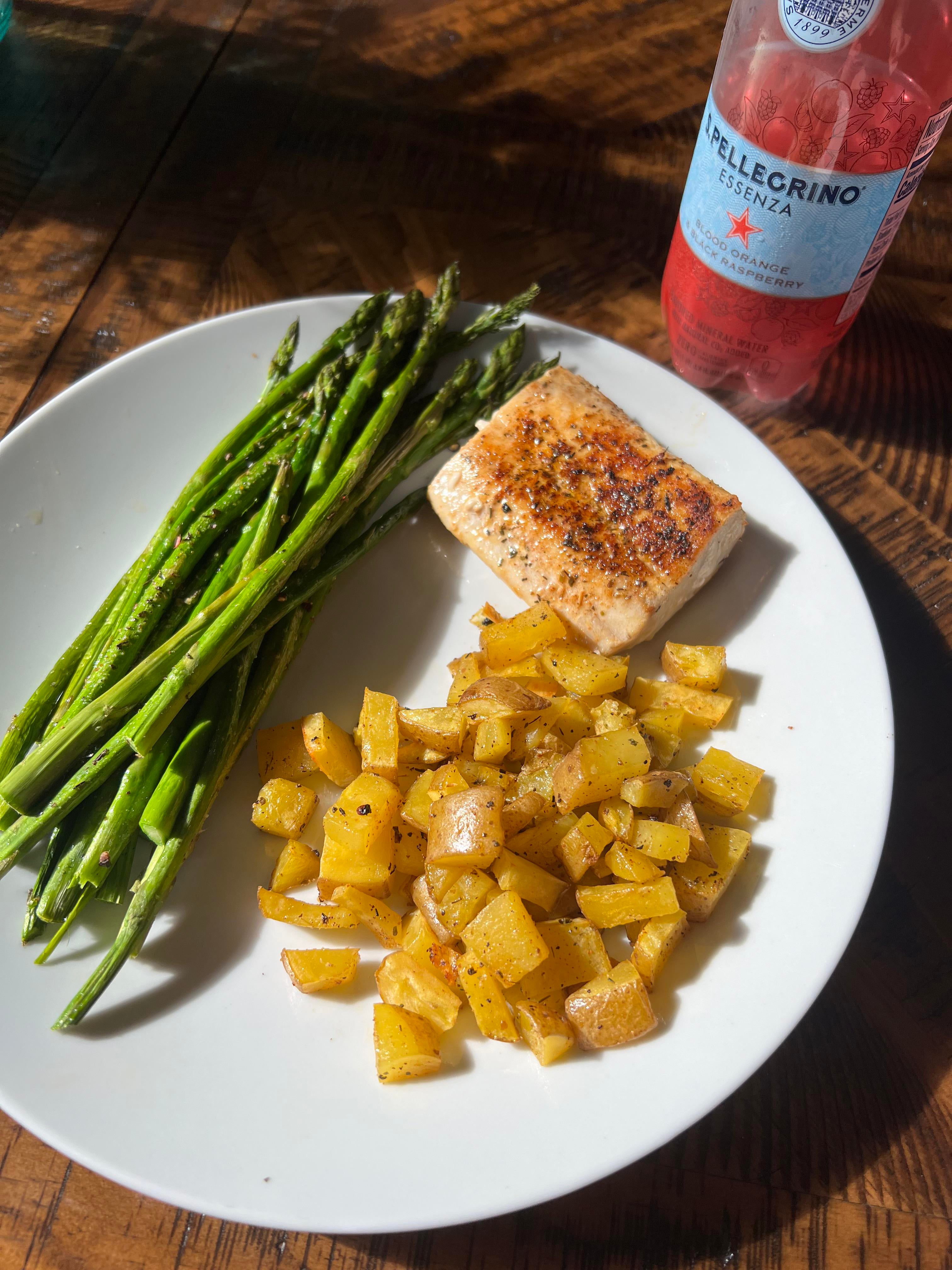Mahi mahi, roasted potatoes, and asparagus. 355 calories, 27 G of protein!