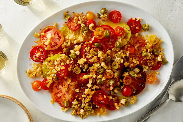 - To serve, drizzle the tomatoes with vinegar followed by the remaining 4 tablespoons olive oil. Just before you’re ready to serve, sprinkle the bread crumbs over the top.