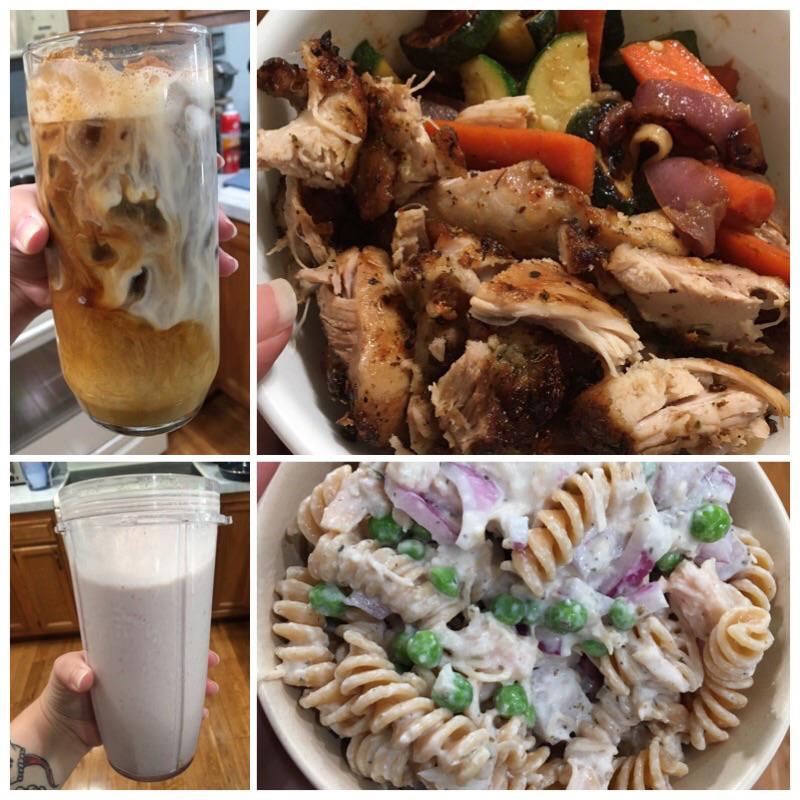Coffee, chickpea pasta salad, smoothie, chicken thighs and veg with udon