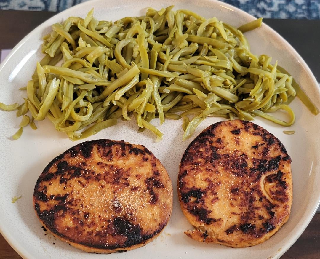 Salmon burgers and a can of green beans (370 calories) very basic but very filling