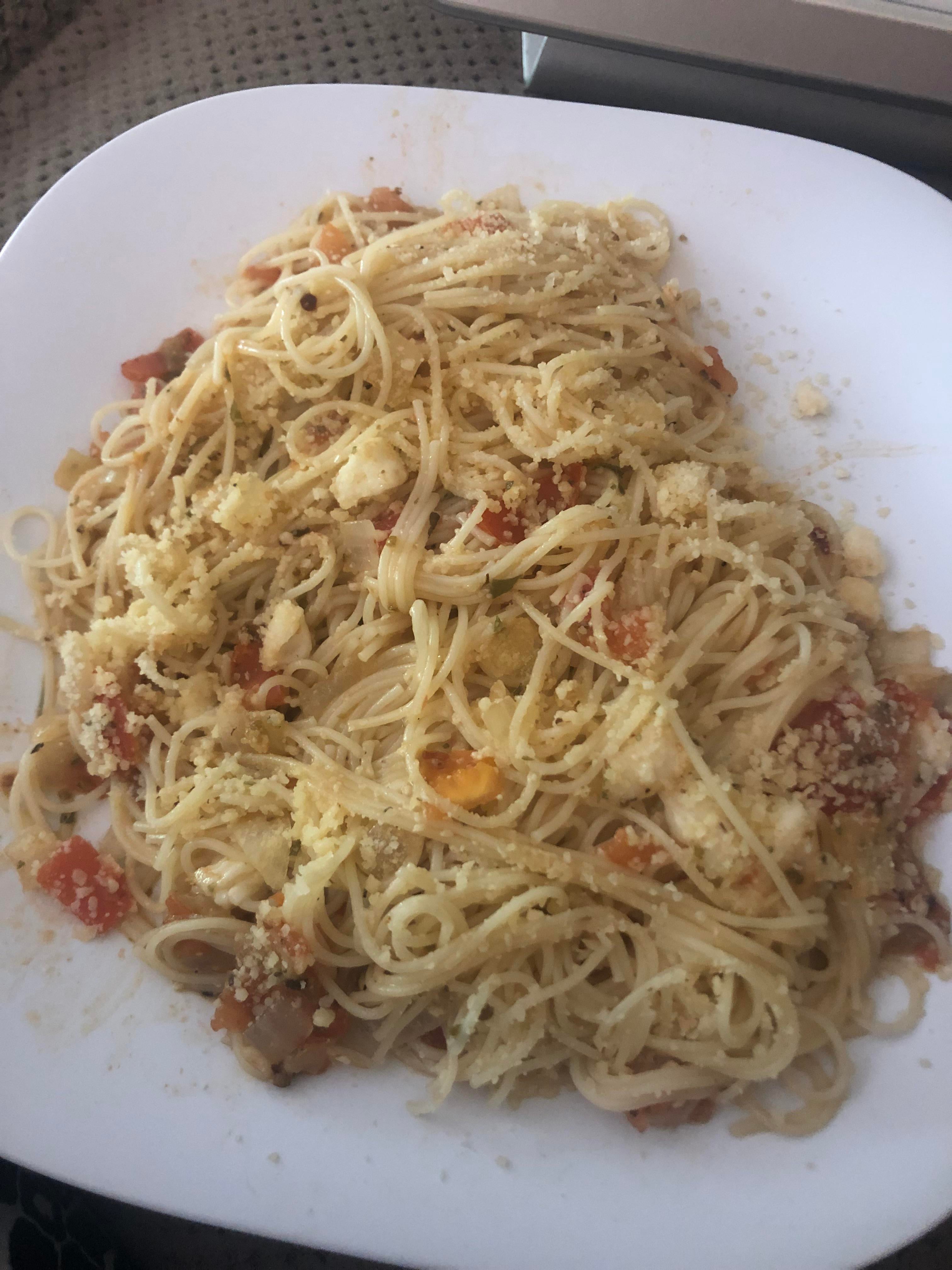 460 calorie pasta dinner! Angel hair with onion, garlic, tomatoes, olive oil, mozzarella, and a variety of spices Dining and Cooking
