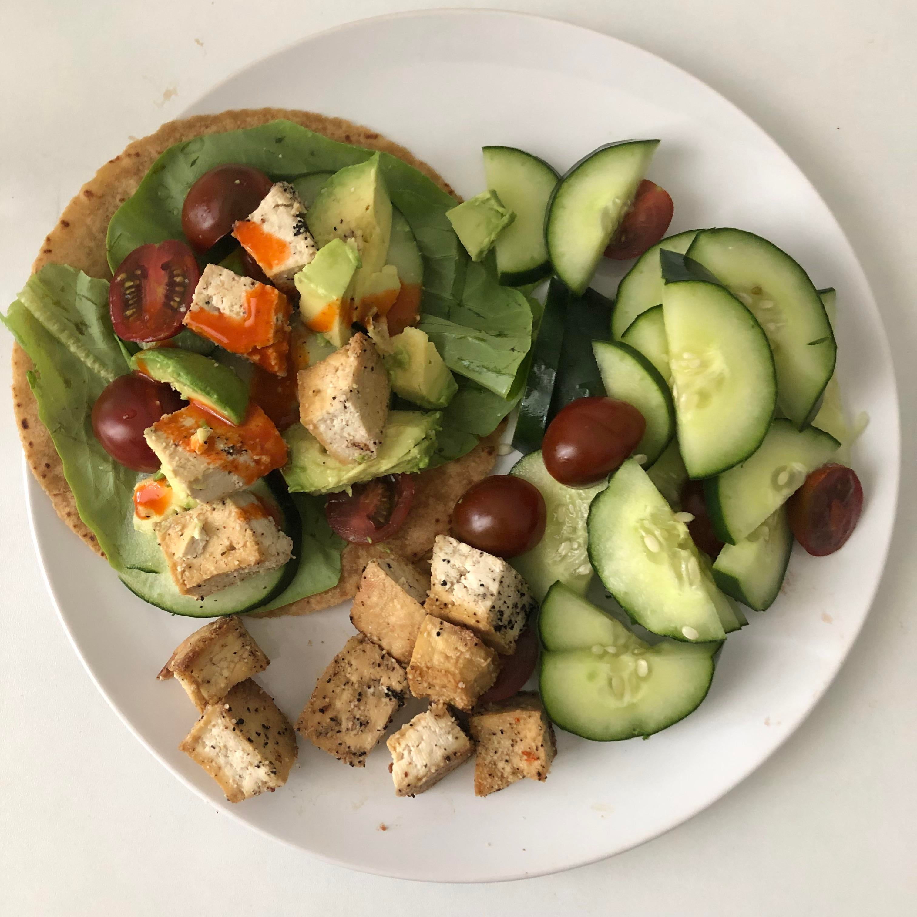 tofu wrap & cucumber salad (420 cals: 27p/25g/21f)