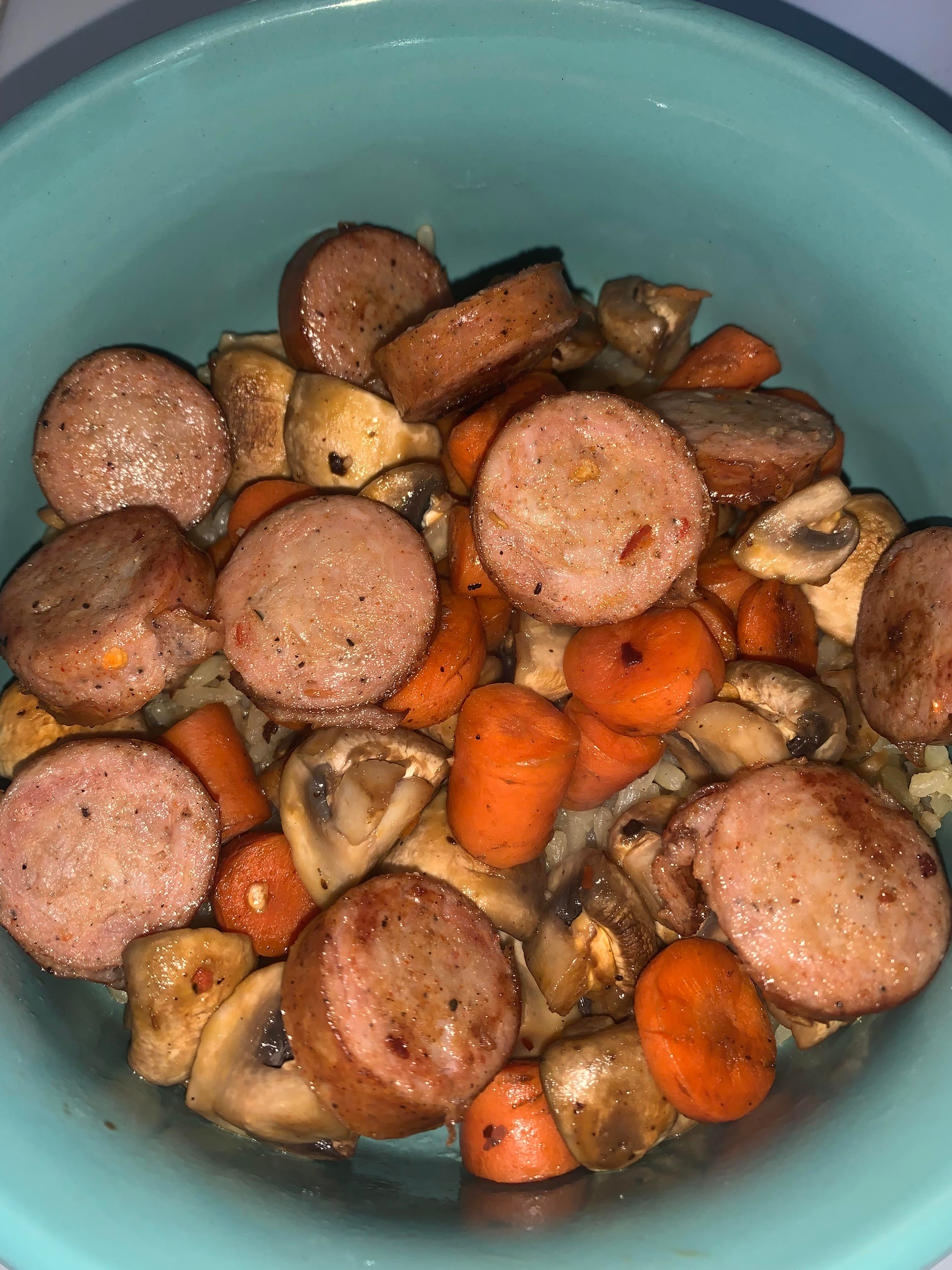 Andouille chicken sausage stir fry bowl with rice pilaf and veggies—only 363 calories!