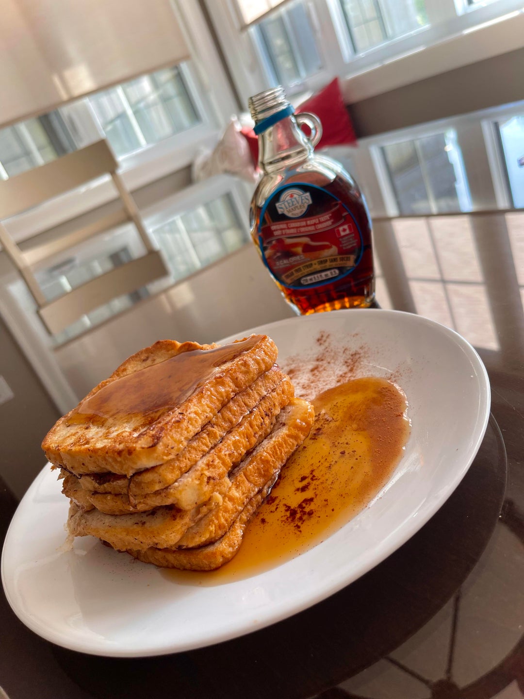 Toast the bread lightly and whisk everything else together on a flat dish. Dunk toast into mixture, turning over a few times with tongs and ‘basting’ the bread. Let excess drip before cooking. Heat up a sprayed pan on medium, and put toast in, spooning a little bit of mixture on top to really coat it (I find letting it drip and then coating it after it’s in the pan helps prevent egg mixture from dripping and cooking around the bread). Turn over once bottom is golden brown and let other side brown up, and serve with more syrup and cinnamon!