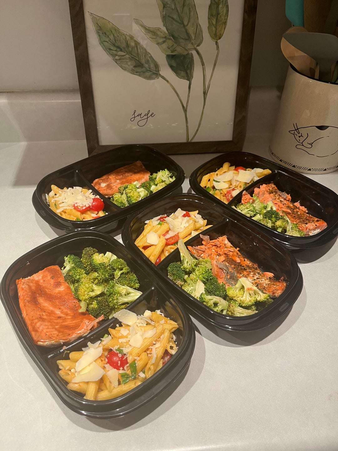 Meal Prep Sunday: Lemon Cajun Alfredo Penne with a side of broccoli and salmon(Cajun two days, mustard two days) 397/407 calories.