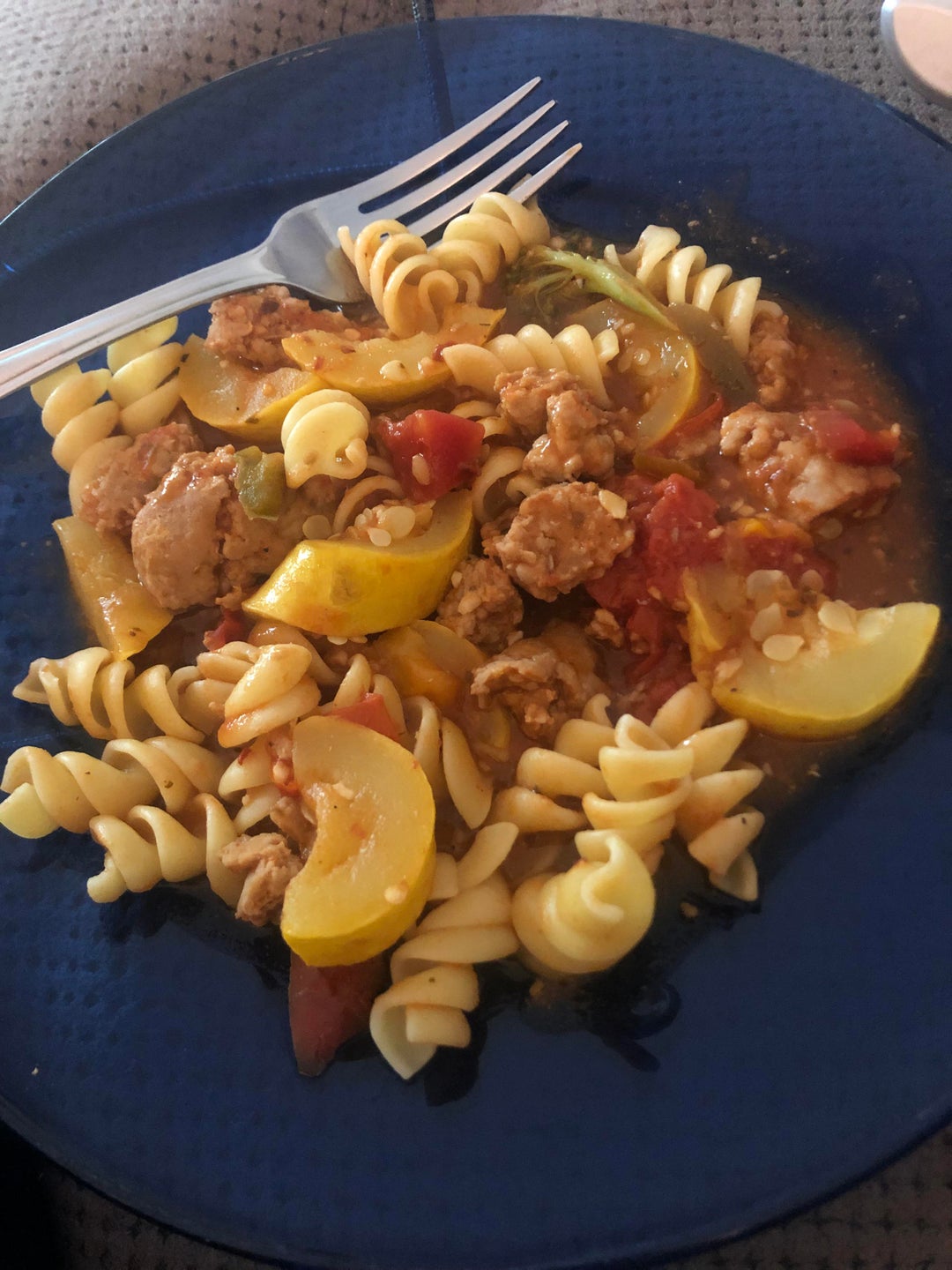 One of my meal prep options for the week, but smelled so good I had one portion today 🙃 387 cals of pasta, veggies, and turkey Italian sausage Dining and Cooking