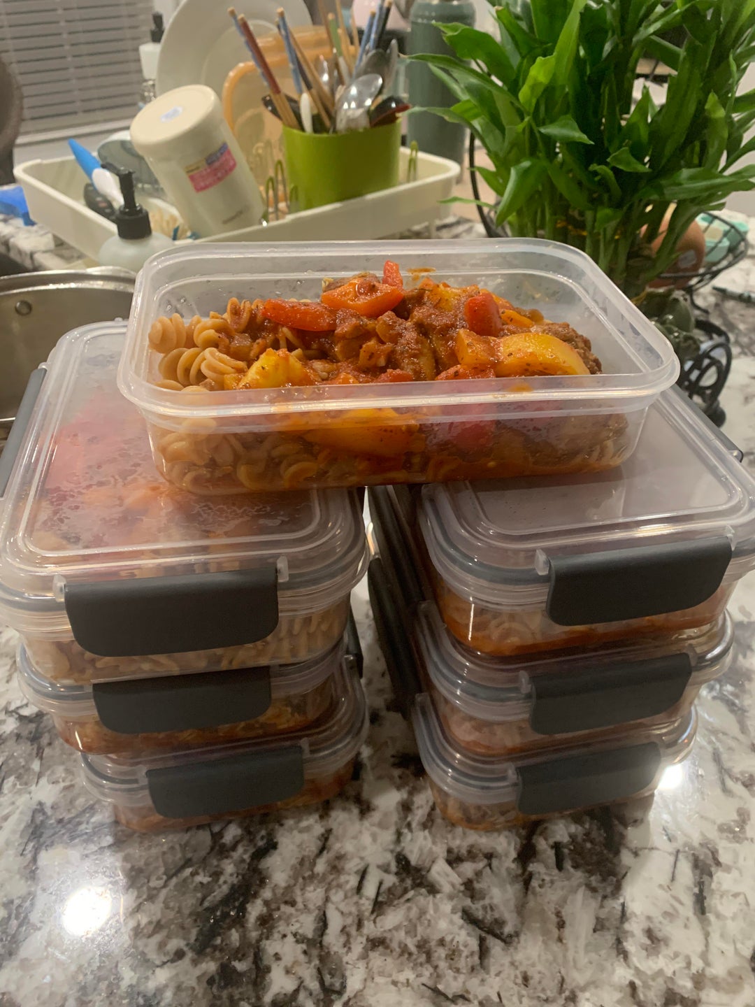 Red Lentil Chicken Pasta ~ Meal prep with gym buddy. 500 cal 50g protein each
