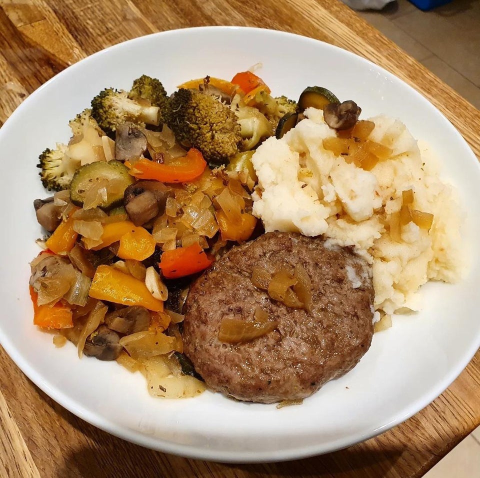 Low fat beef burger patty, roast vegetables cooked in Frylight and Idahoan bacon and cheese mash 😋 Dining and Cooking