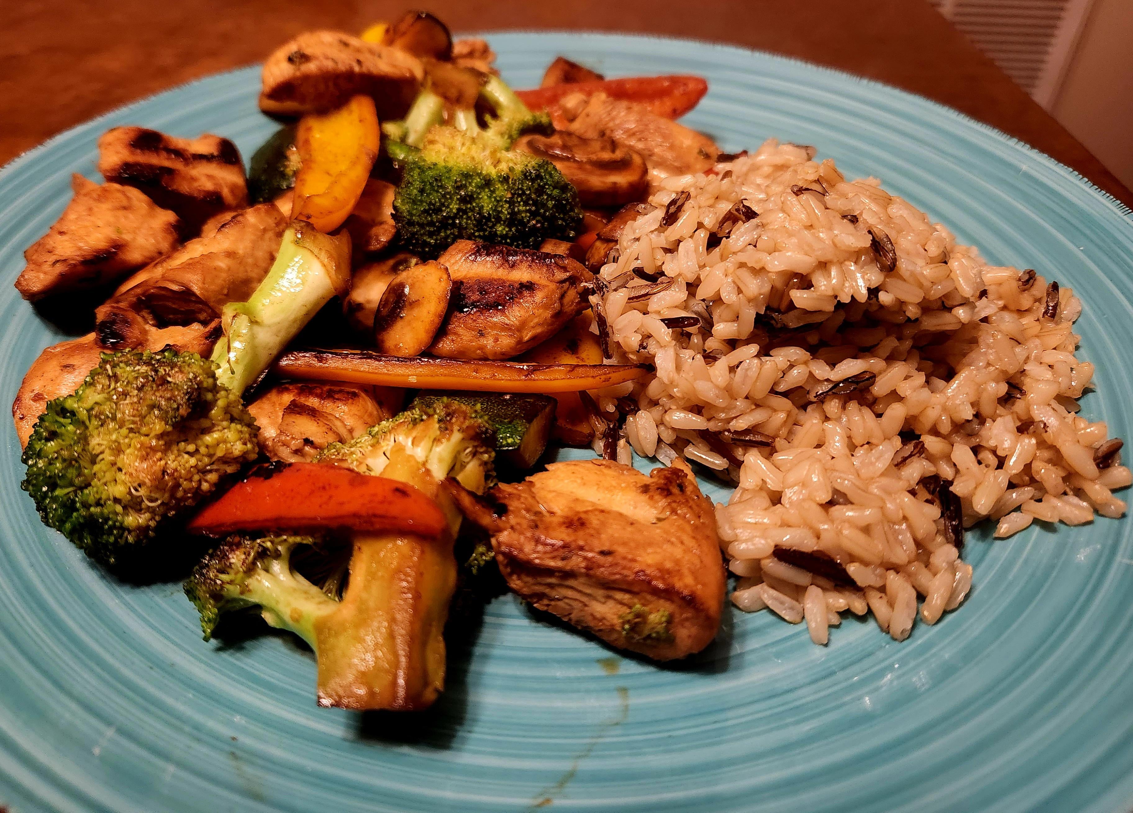 Busy day at work and didn’t get to eat much- treated myself to a bigger dinner than usual. Chicken stir fry w/ broccoli, zucchini, mushrooms, peppers and brown rice on the side. ~580 calories.