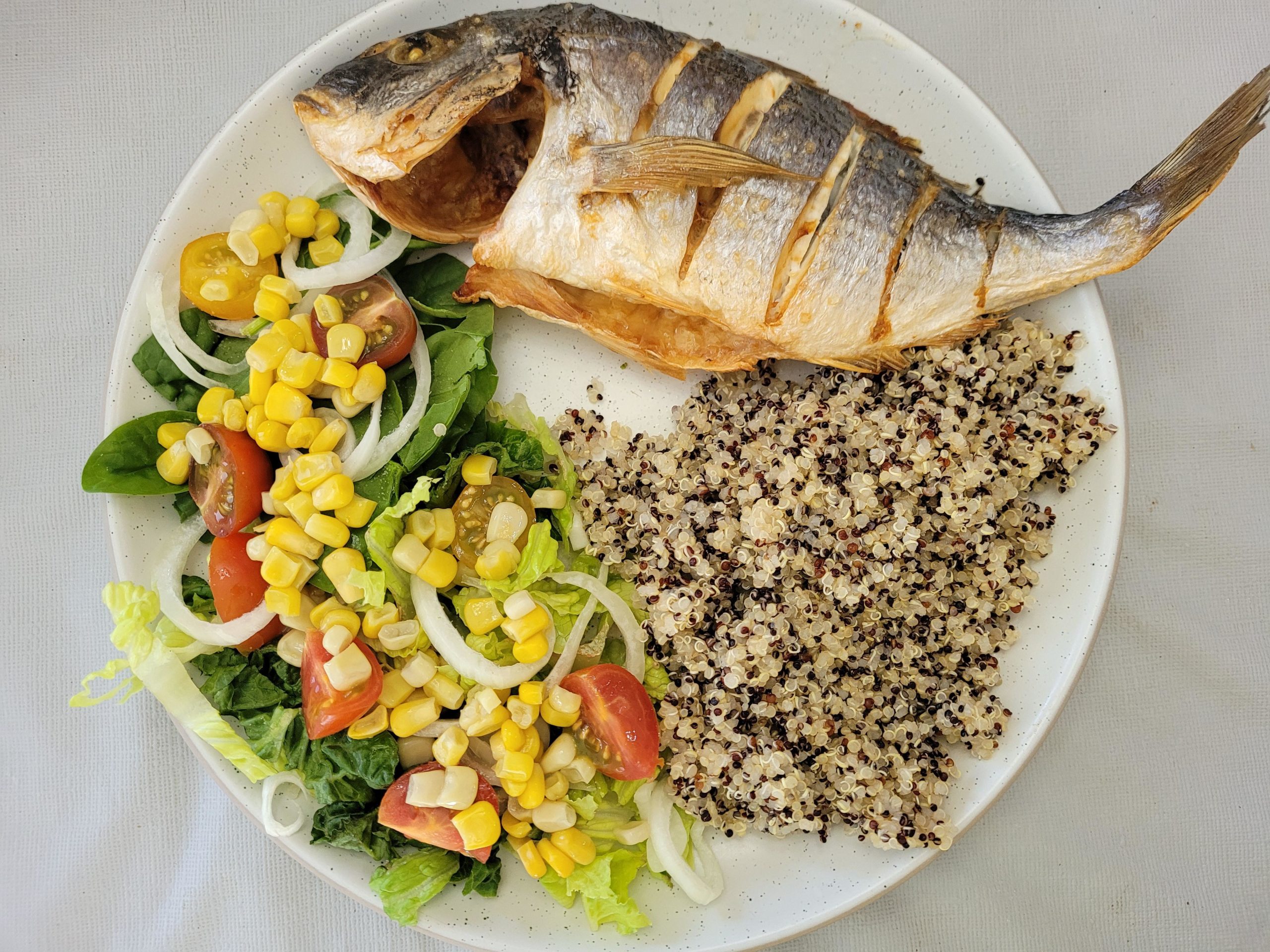 Nutritious and filling lunch! Salad, airfried Seabream and quinoa 🥰