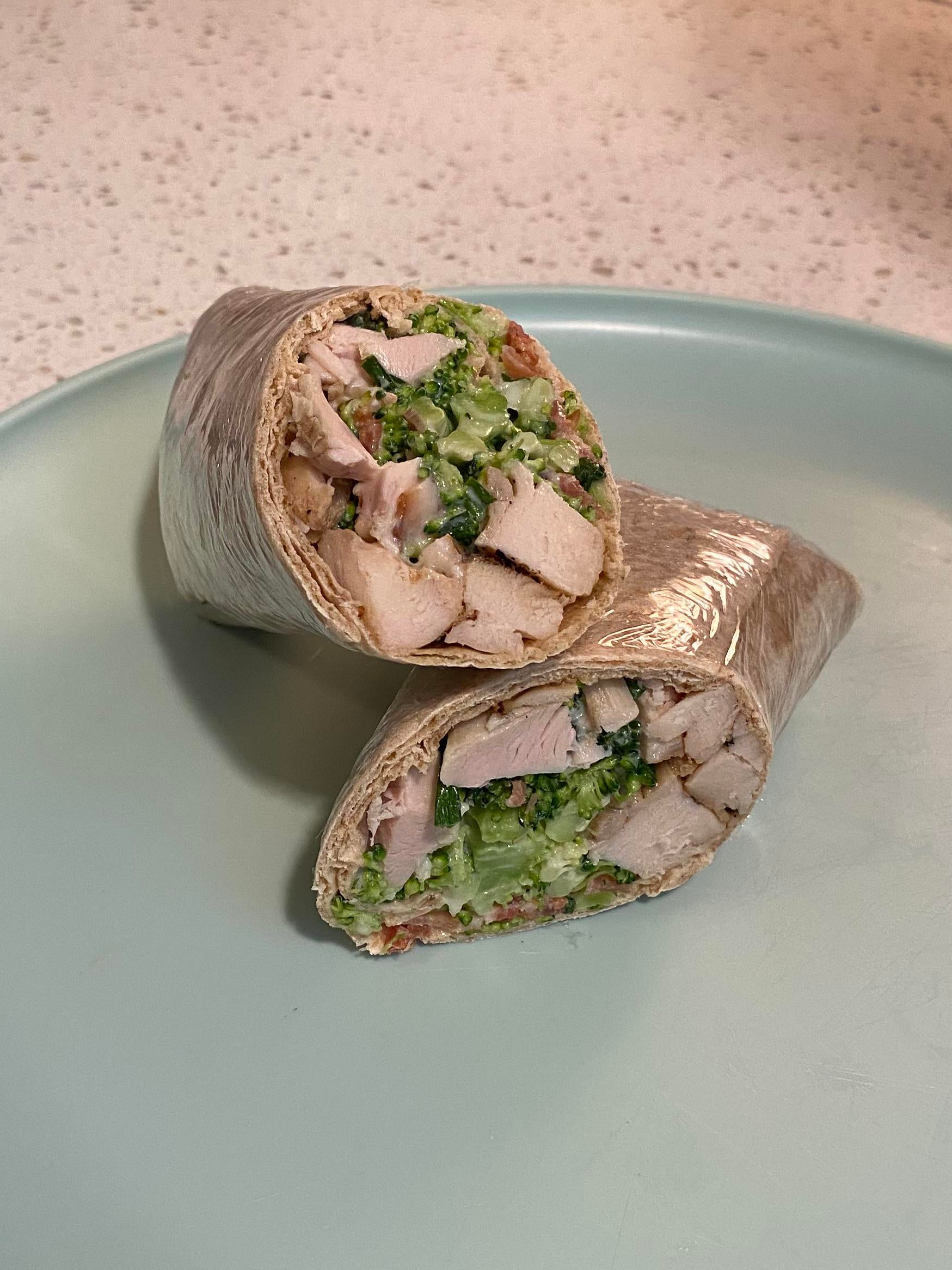 Grilled and chilled chicken thigh with raw broccoli salad in a soft lavash wrap