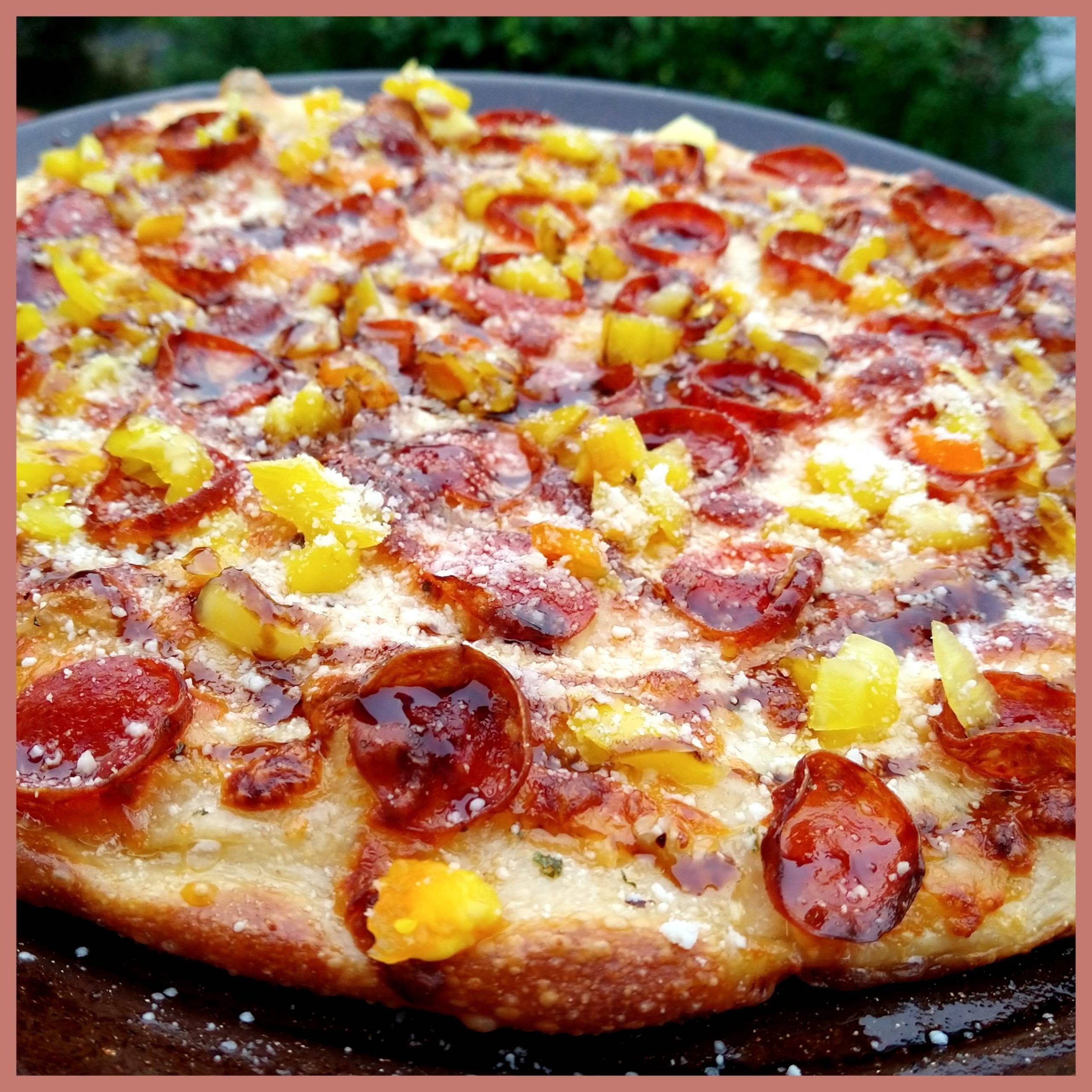 Garlic Butter Pizza w pepperoni, banana peppers, and balsamic reduction