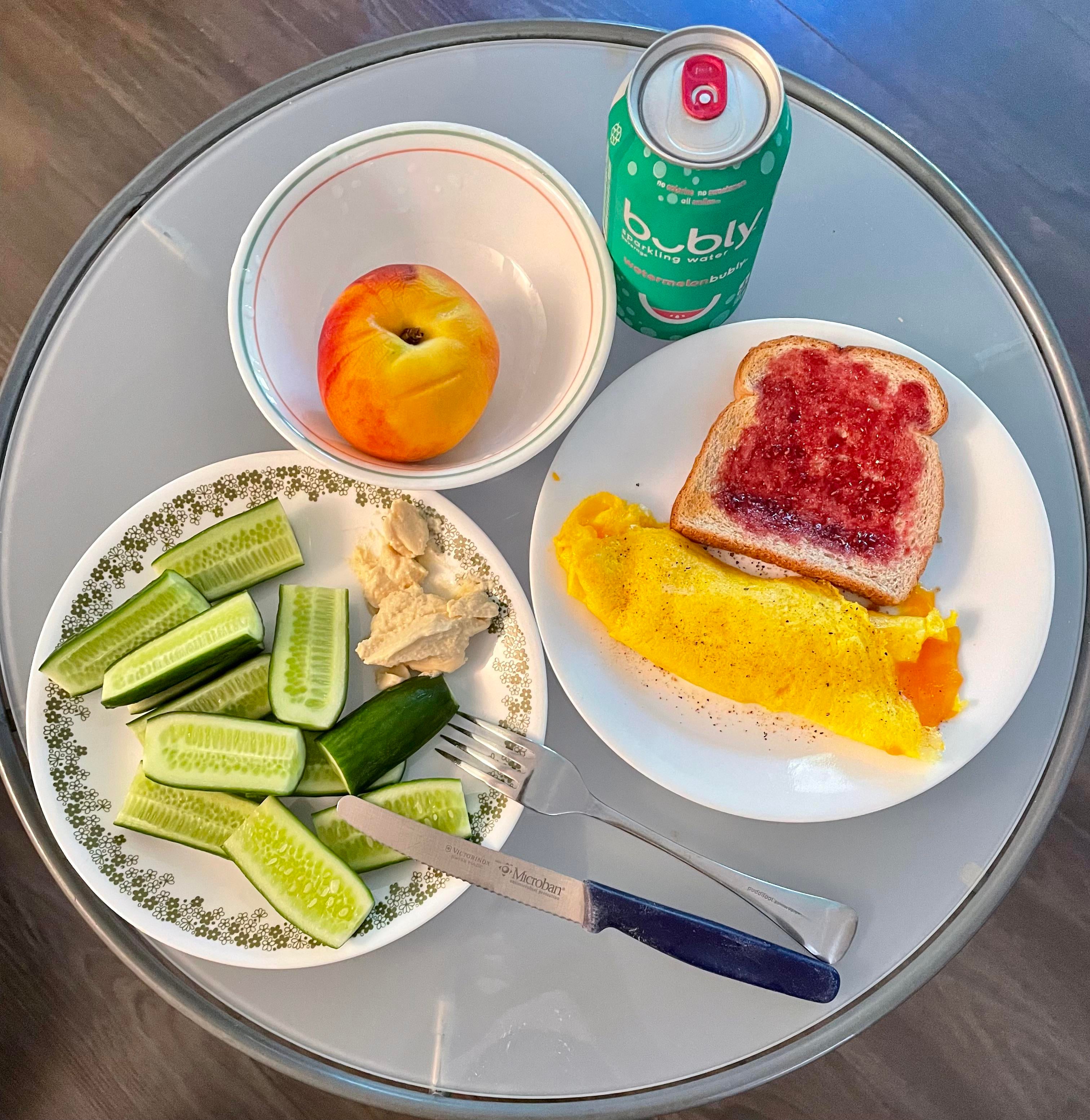 ~550 calories. I like proving that you can eat delicious, rich food in moderation. 2 egg French style omelette with generous cheddar filling, whole wheat toast with raspberry jam, cucumbers and hummus, nectarine, Bubly.