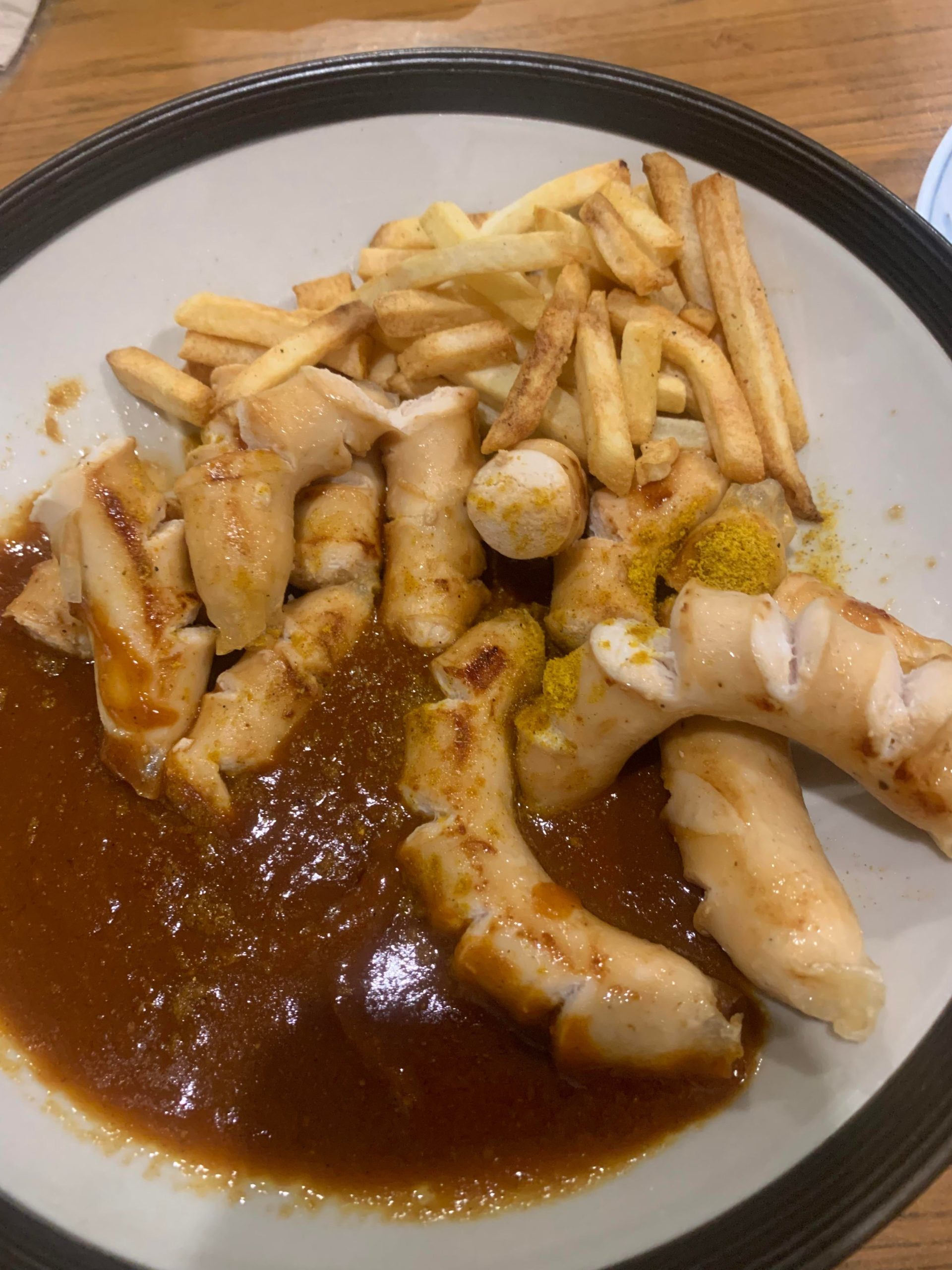450 cal currywurst! Low fat chicken breast sausage, airfryer french fries and curry tomato sauce Dining and Cooking