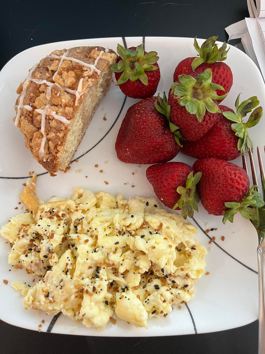 Using “nutrition by addition” theory to turn half a Costco muffin into a satisfying full meal that will last until lunch. I adore these muffins and enjoy finding a way to have them and still meet my goals.
