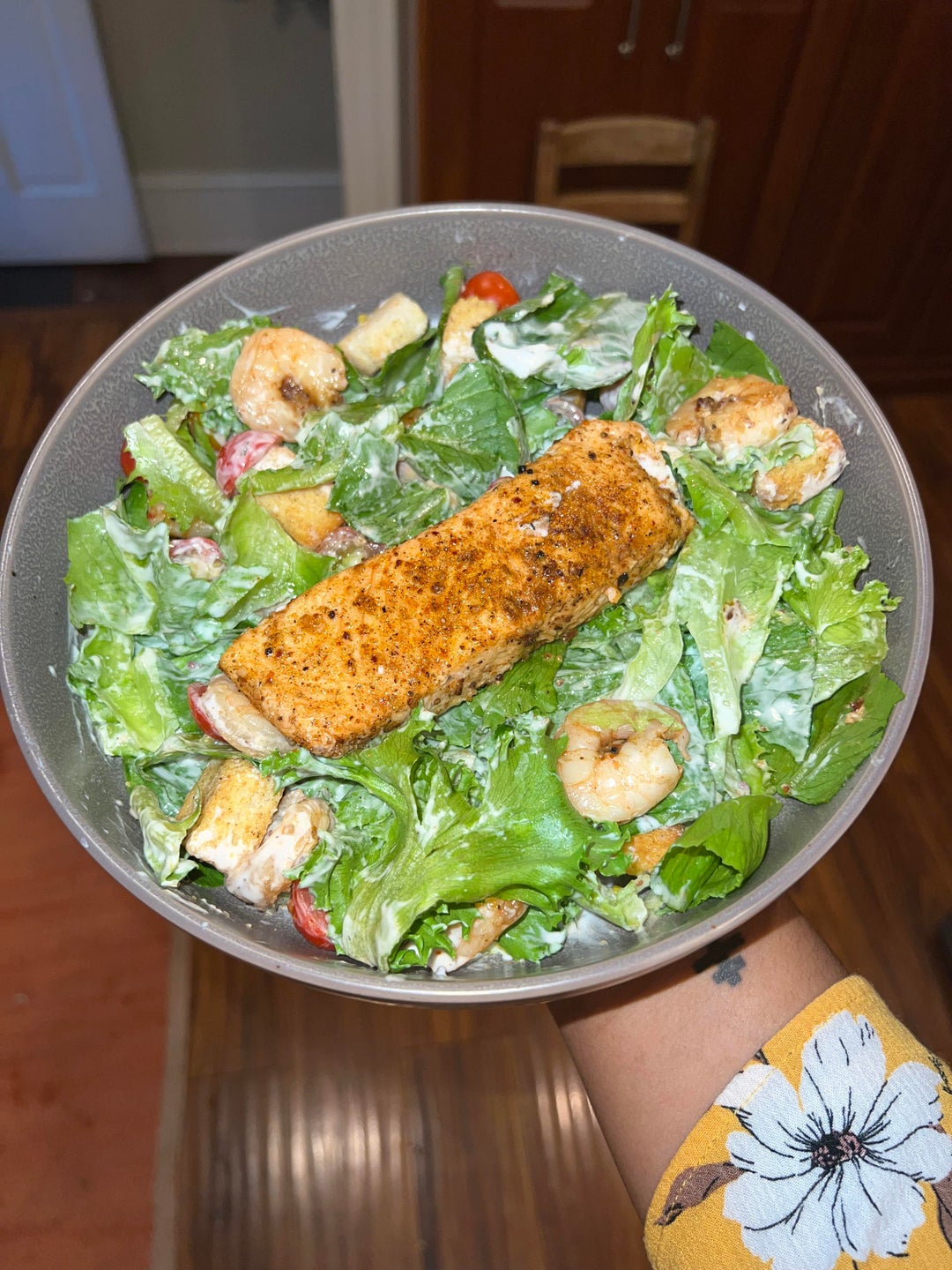 550 cal – Salmon shrimp tzatziki salad! 10/10 🤍✨