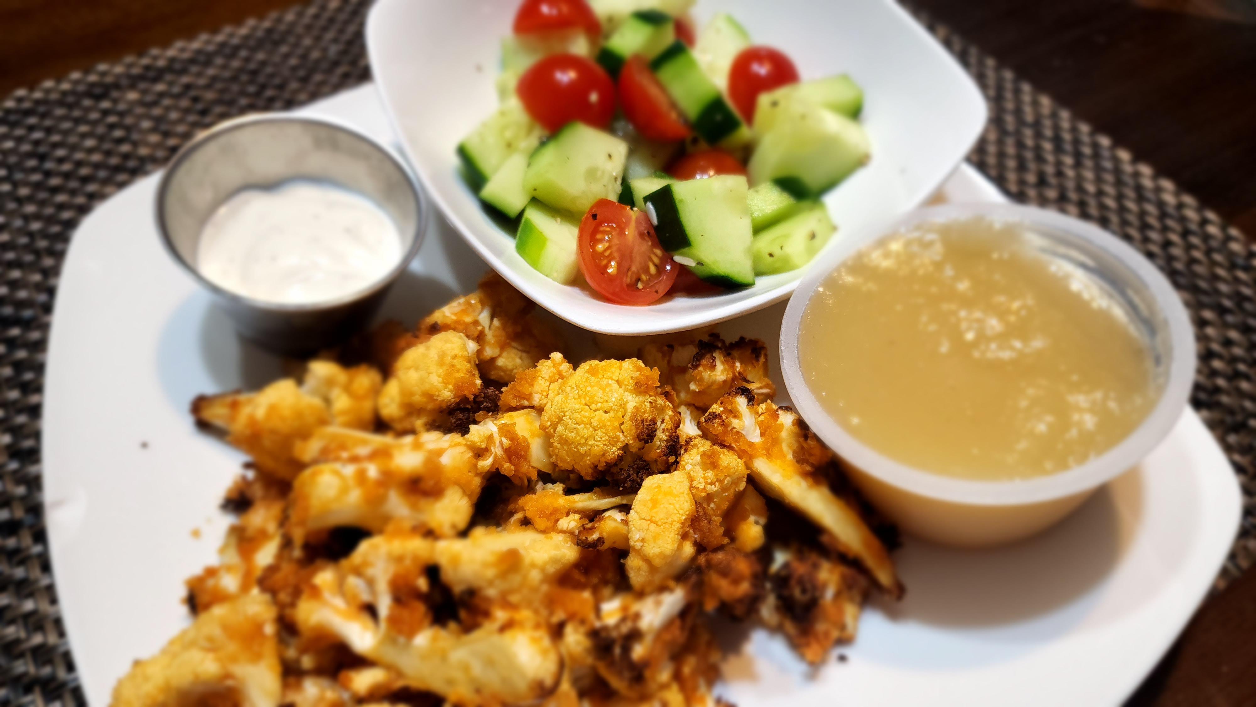 Buffalo cauliflower with apple sauce, and salt and vinegar cucumber salad. 360 Calories. Dining and Cooking