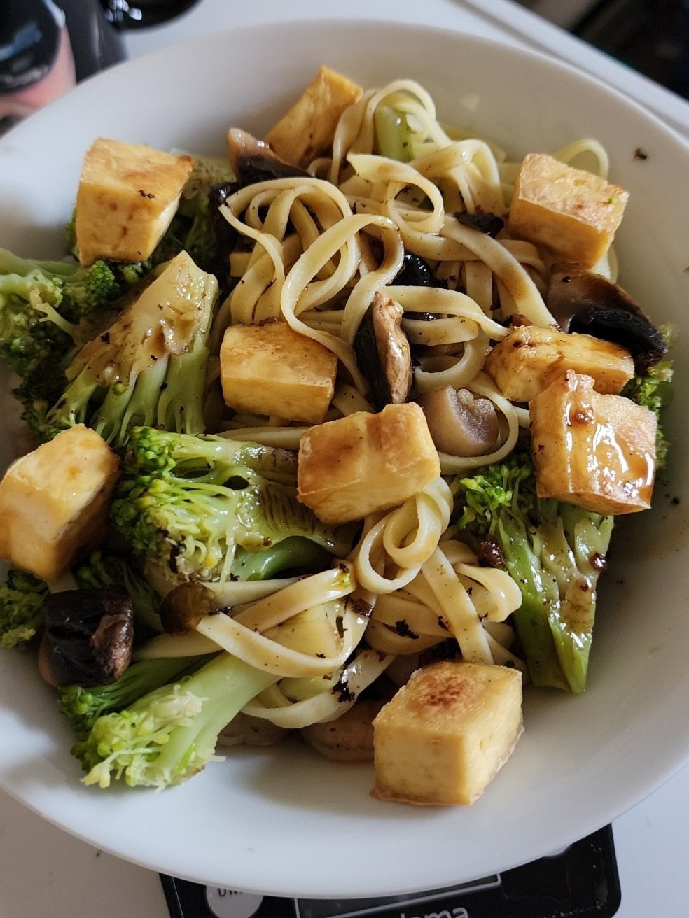 401 calorie dinner – Fettuccine noodles with tofu, mushrooms, broccoli, shrimp, and a yummy sauce (mostly made of sesame oil, soya sauce, brown sugar). Can post recipe in comments if desired :)