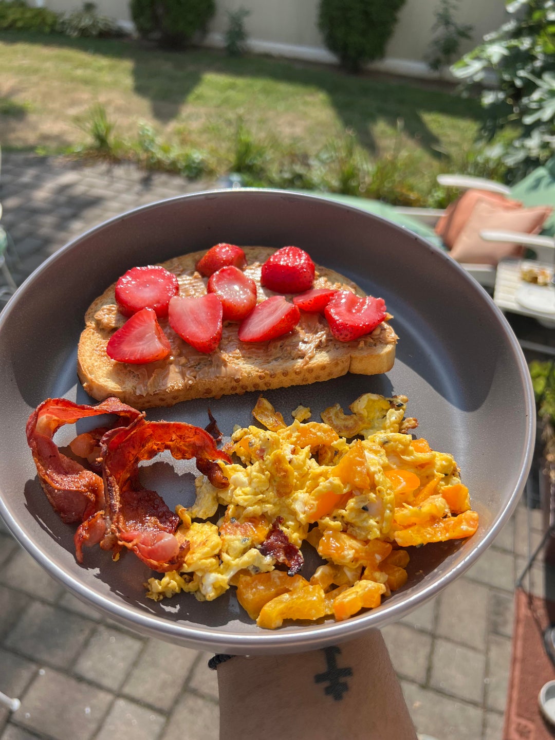 475 Breakfast- peanut butter strawberry toast and a scrambled egg with bell pepper and bacon! Dining and Cooking