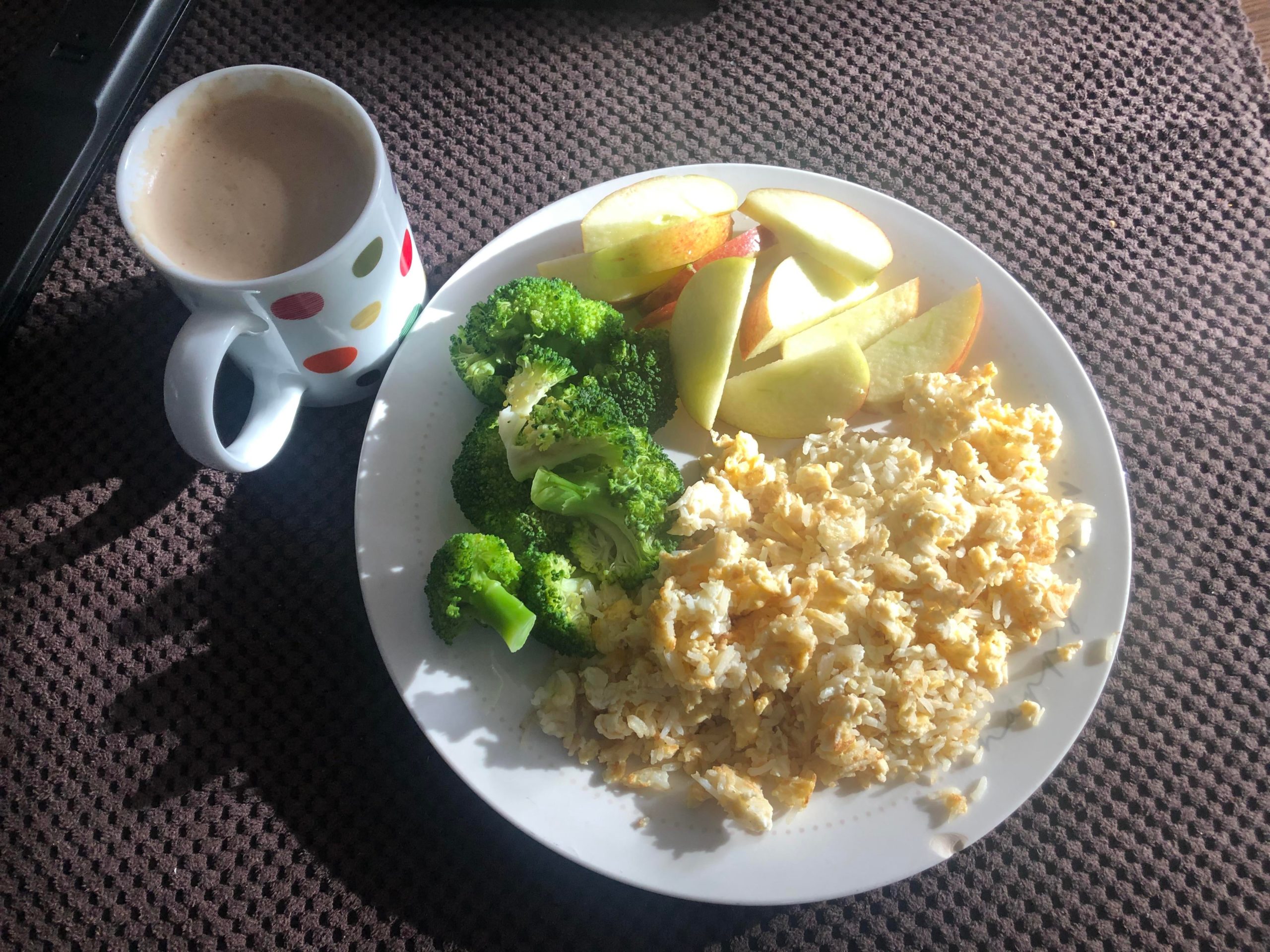 We had left over white rice in the fridge, so I made a super simple egg fried rice for breakfast this morning with a side of apple and steamed broccoli (460cal)