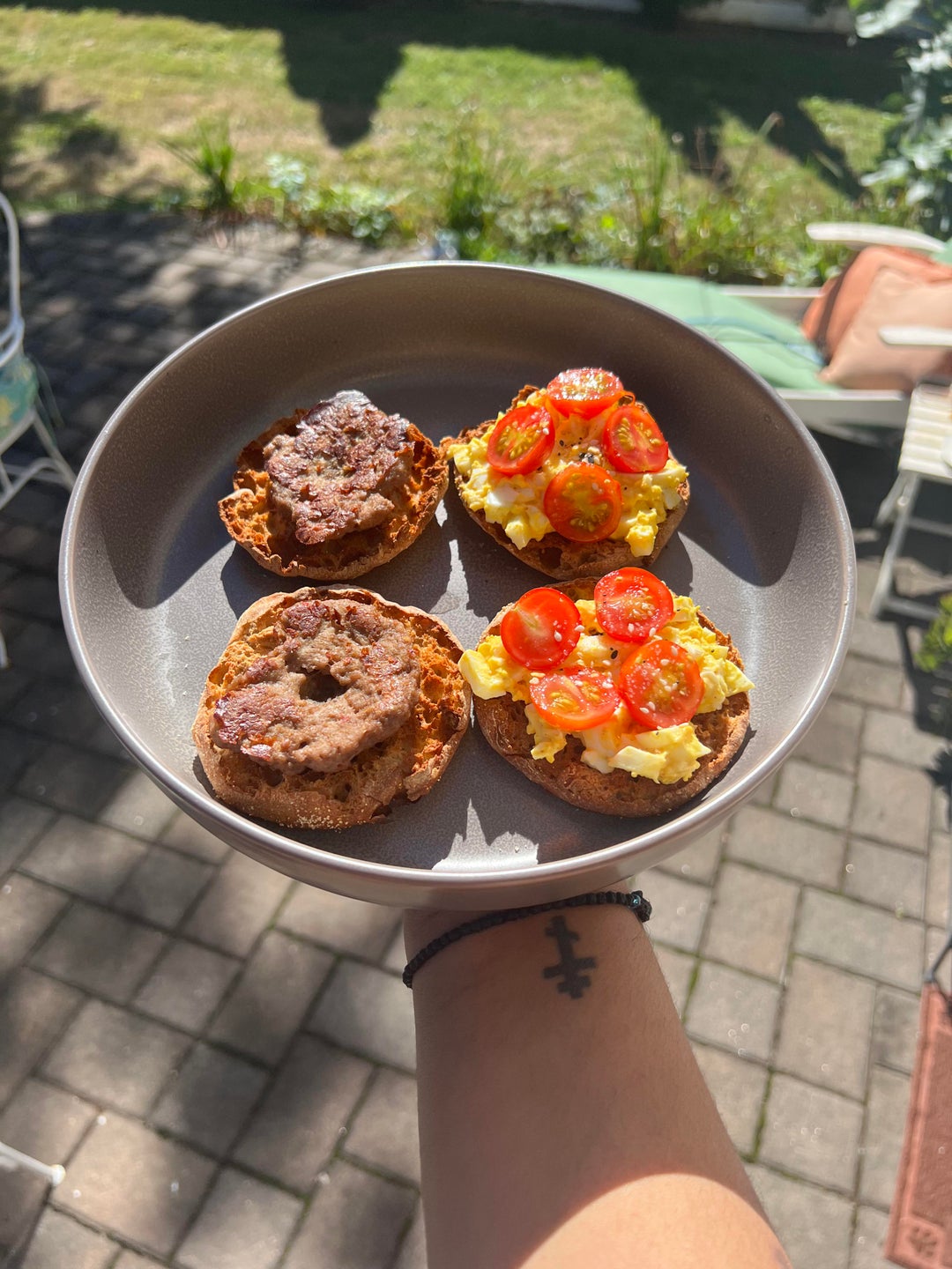 390 calorie breakfast – egg salad turkey sausage English muffins! 🤍☺️