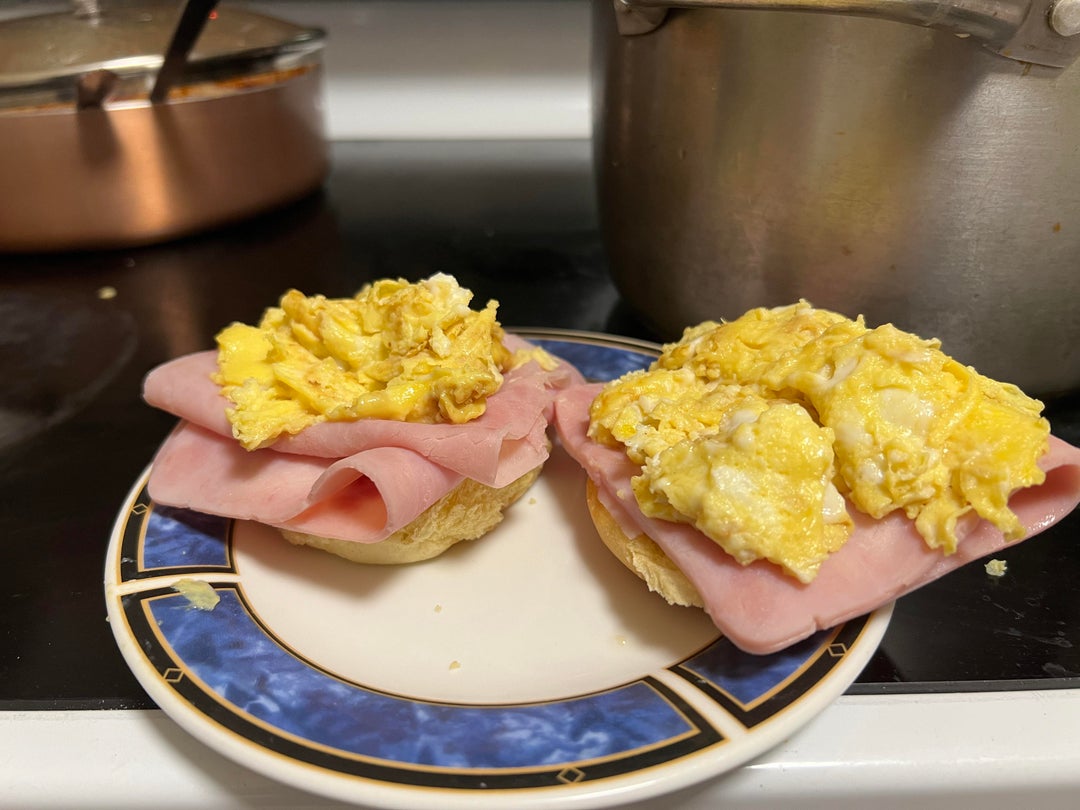 hearty breakfast sandwich for dinner – 366 cal. next time i’m using half the ham since it’s pretty salty