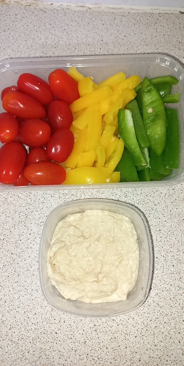 212 calories snack- 180g bell pepper, 150g plum tomatoes, 80g Eastmans’ reduced fat hummus Dining and Cooking