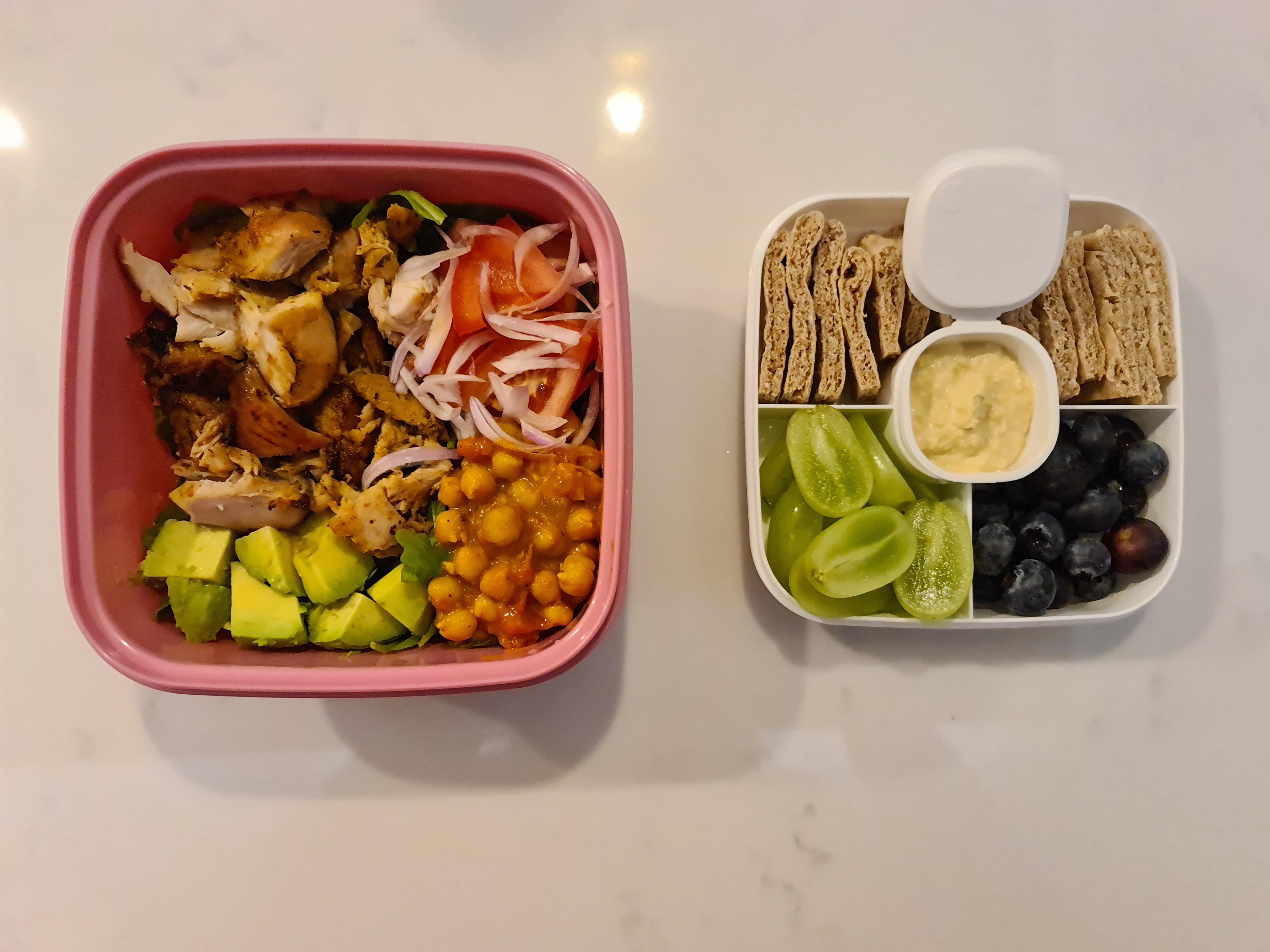 tomorrow’s lunch: chicken, arugula, avocado and chickpea salad (504 calories)