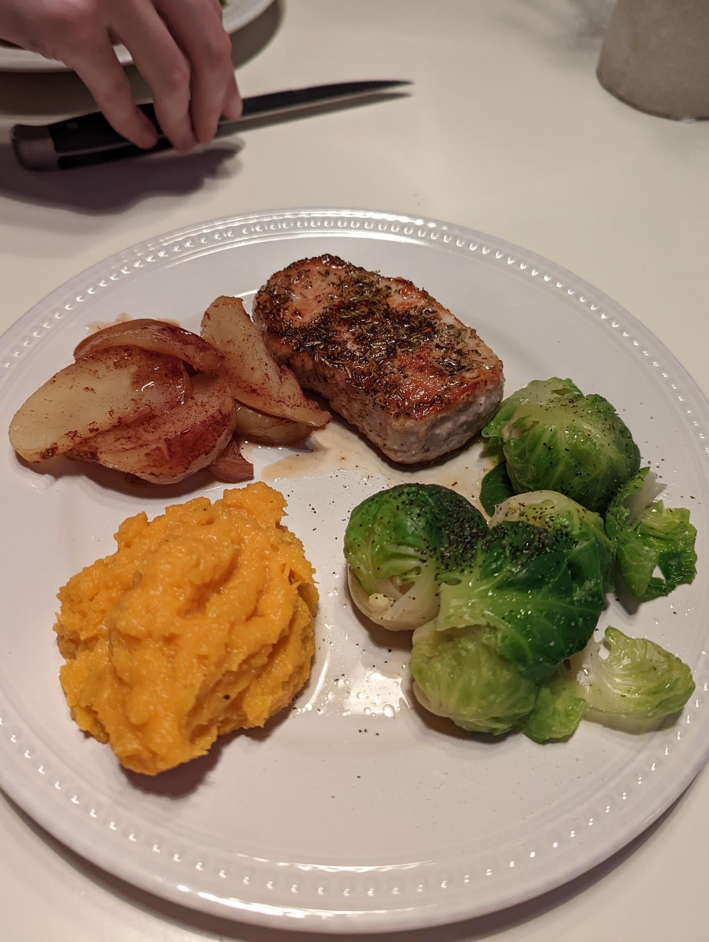 today’s dinner – pork loin ‘ sprouts, baked apples and butternut squash totalling 500 calories