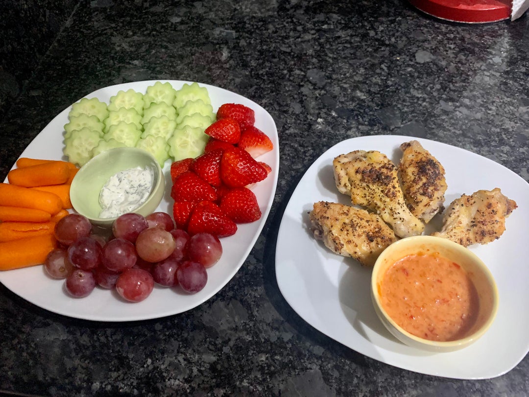 Air-fryer wings and snack plate (sweet chili dipping sauce for wings and dill dip for veggies) – 768 cals Write A CommentYou must be logged in to post a comment.