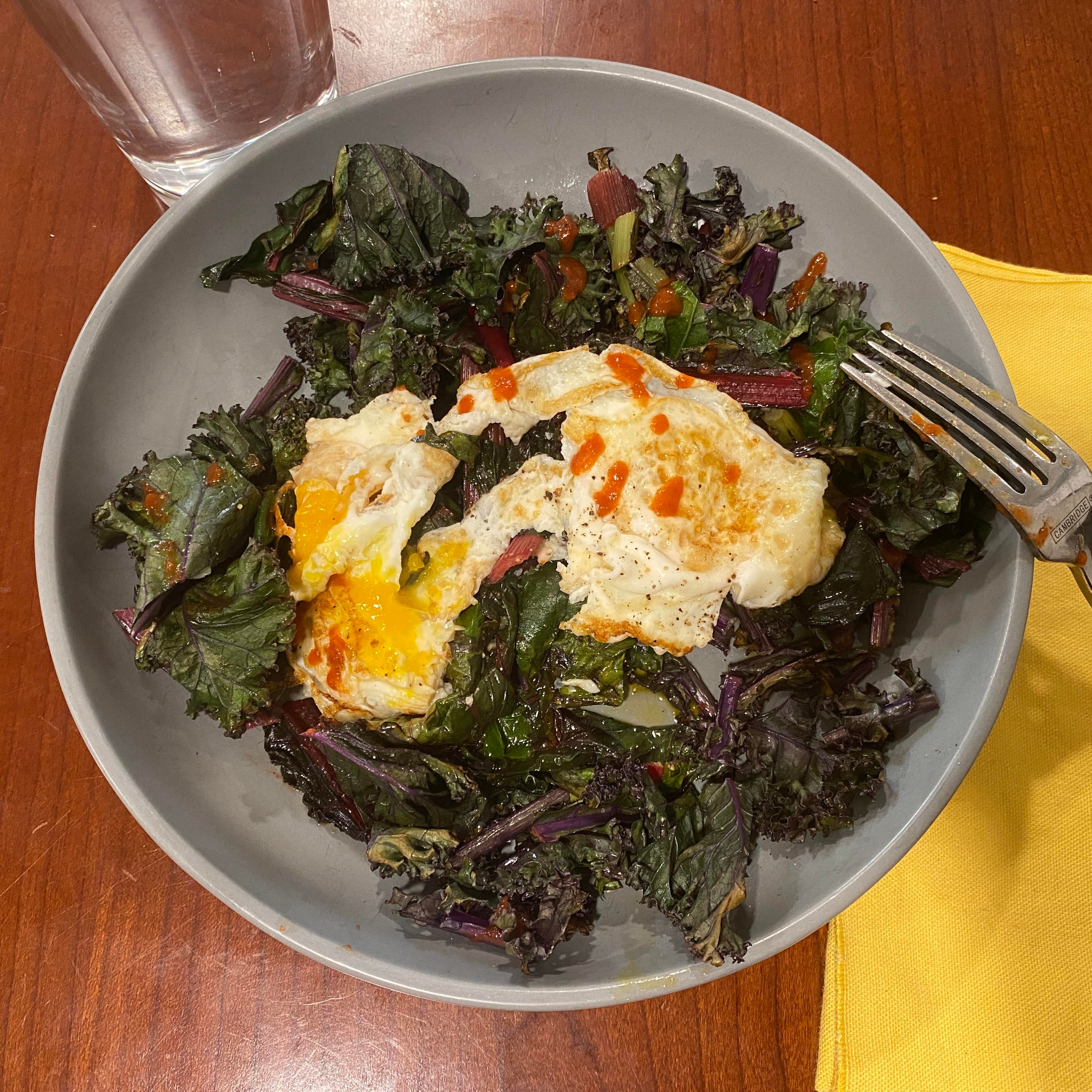 2 fried eggs, 3 cups swiss chard and curly kale, some butter, and a dash of sriracha. My favorite “warm salad” lately for 308 calories! Write A CommentYou must be logged in to post a comment.