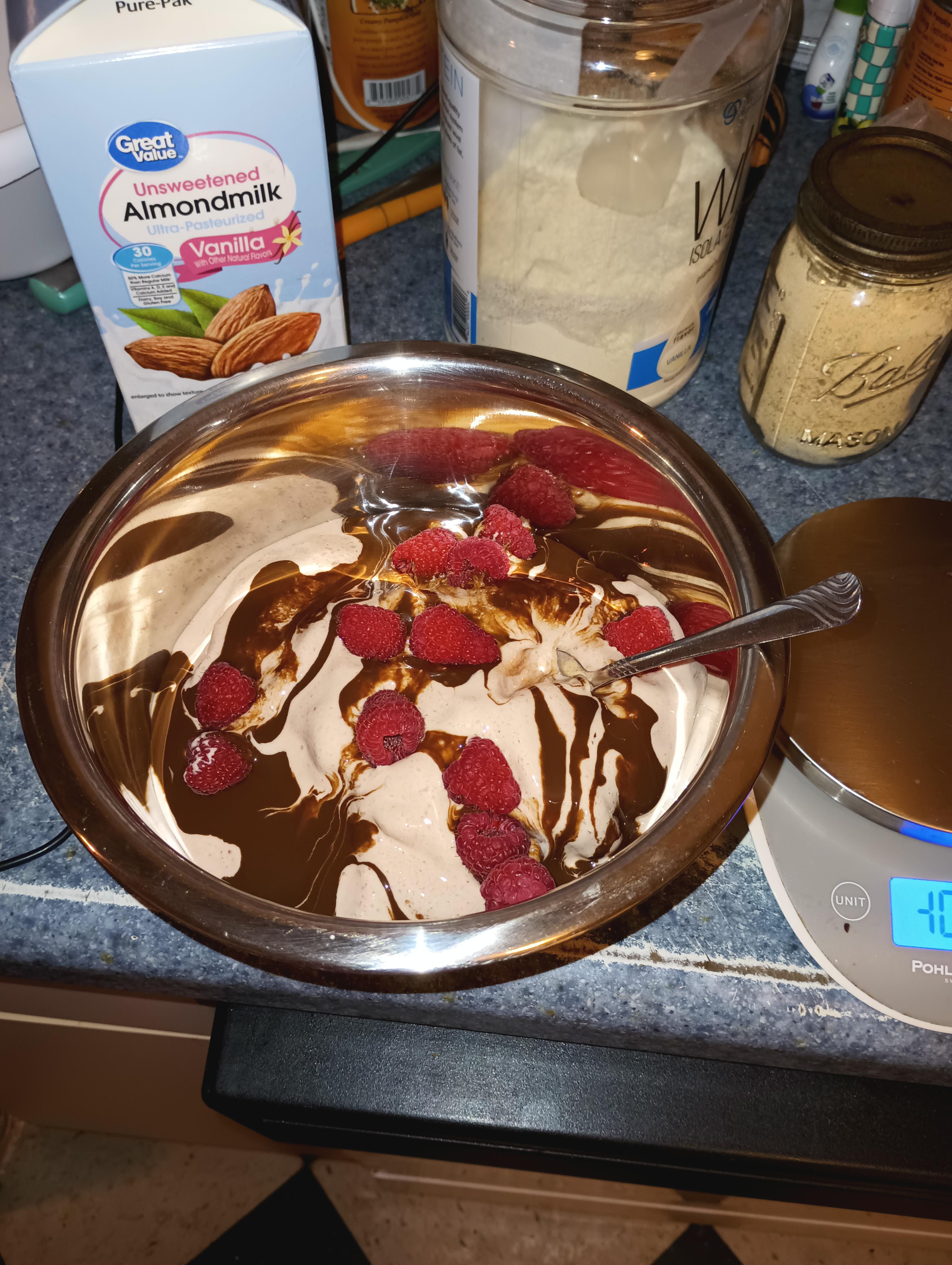 facebookyouknow 3 years ago It’s a massive bowl of protein ice cream from coach Greg1 scoop protein powder, 110 calories, 20 grams protein 1 light Greek yogurt, 80 calories, 13 grams protein 150 grams of frozen strawberries, 50 calories 50 grams raspberries, 25 calories 60 grams sugar free chocolate syrup, 20 calories 8 grams pb fit, 35 calories, 4 grams protein Half cup almond milk, 15 calories Pinch of xantham gum 325 grams of ice.335 calories, 37 grams protein.Add to blender wet ingredients first, then powder ingredients, frozen ingredients on top. Blend until smooth and fluffy