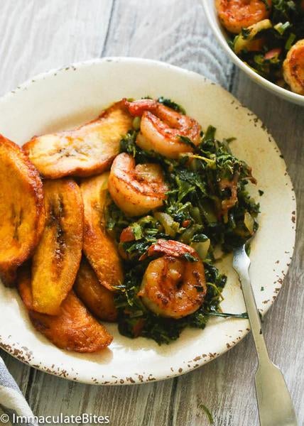 * 1/2- 1 teaspoon creole seasoning (or your favorite spice mix) Adjust to taste * ½ pound shrimp peeled and deveined * ½ pound chopped smoked turkey * 1 medium onion sliced * 2 teaspoons minced garlic * 1 -2 teaspoons thyme optional * 4-5 fresh tomatoes chopped * ½-1 teaspoon cayenne pepper, whole scotch bonnet pepper works too! * 1- teaspoon paprika * 3 pounds spinach frozen thawed and drained * ½ -1 cup canola oil * Salt and pepper to taste * 1- teaspoon bouillon powder or Maggie cube optional