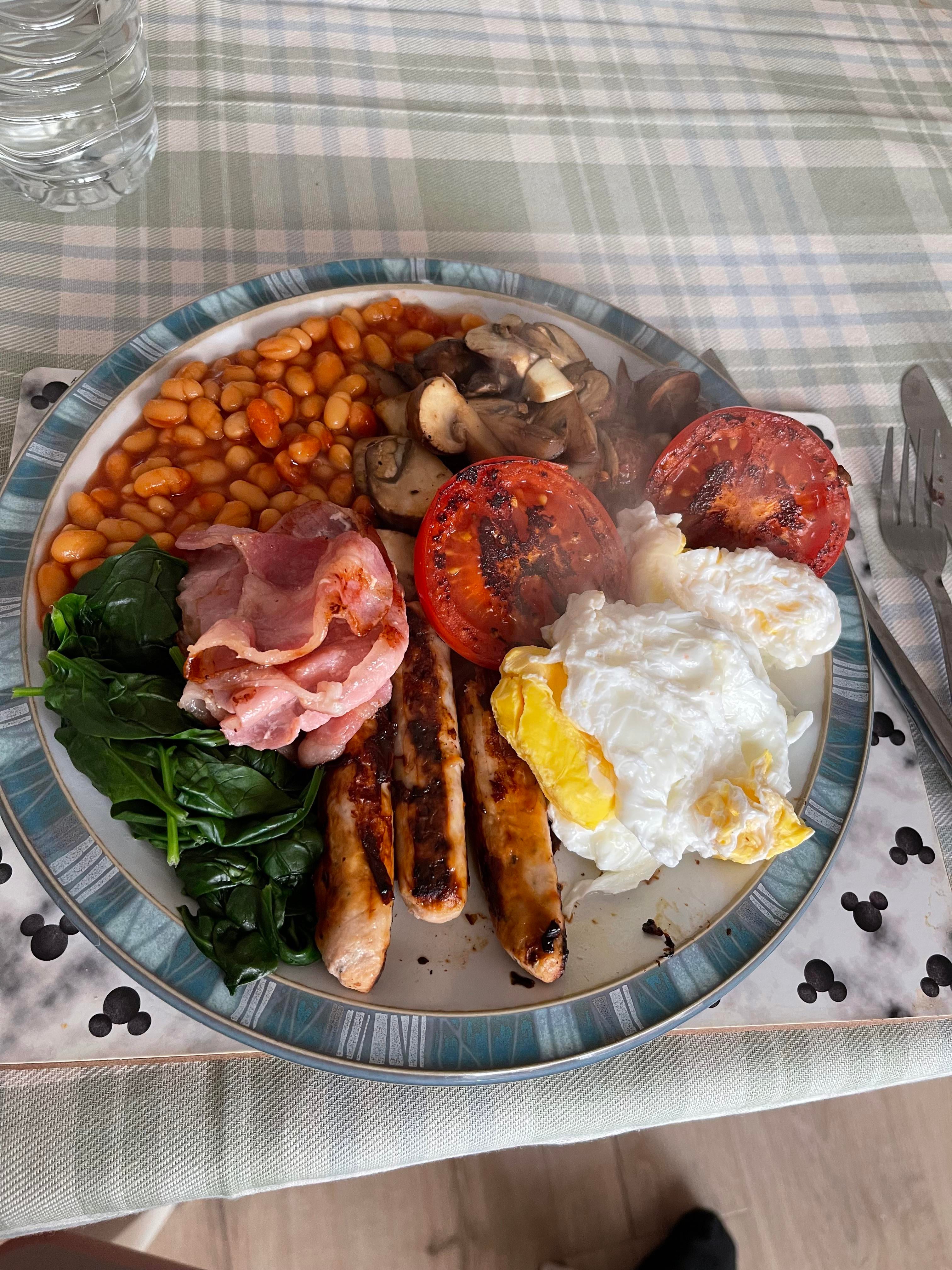 Low Sugar Beans Garlic Mushrooms Spinish Poached Eggs Chicken Sausages Grilled Tomatoes 540kcals. This diet really is making me eat better no buttery toast and hash browns which would probably doubled the kcal count