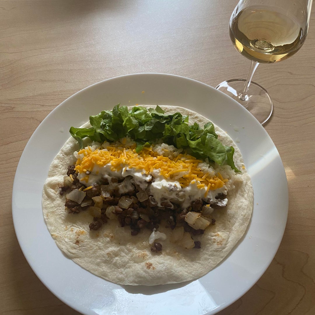 Ground beef burrito with onions, rice, home grown lettuce, sour cream, and cheese by tifacake Write A CommentYou must be logged in to post a comment.