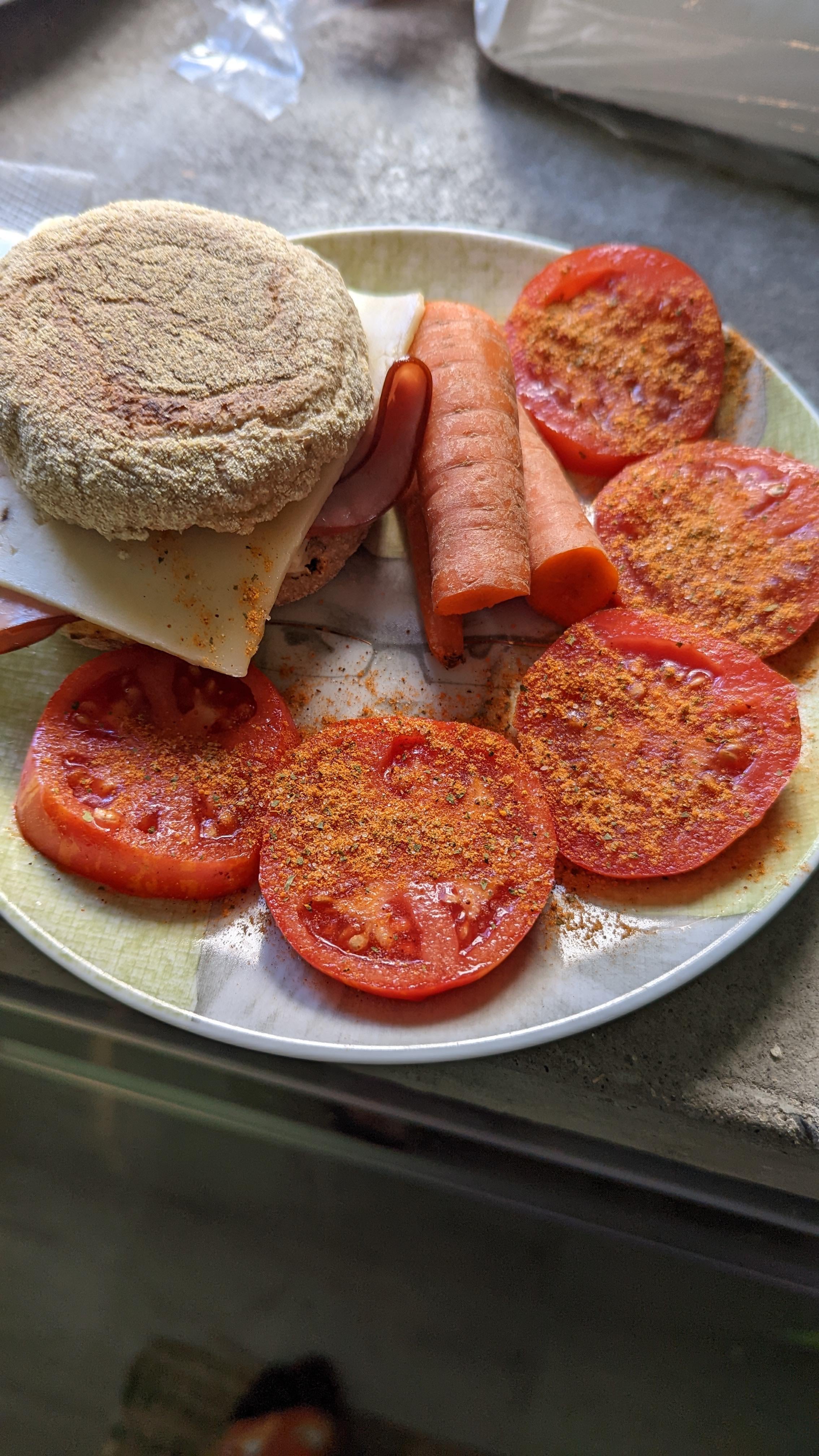 otterbelle 3 years ago Egg sandwich – One egg, one English muffin, one slice of cheese, 2 slices of ham.Carrot – Single carrot snapped into three pieces, about 50 grams. I normally have more carrots, but had a late breakfast and wasn’t very hungry.Tomatoes – A couple of tomatoes from my garden, sliced and topped with Elote seasoning from Trader Joe’s. Tomatoes weigh in at about 100 grams.