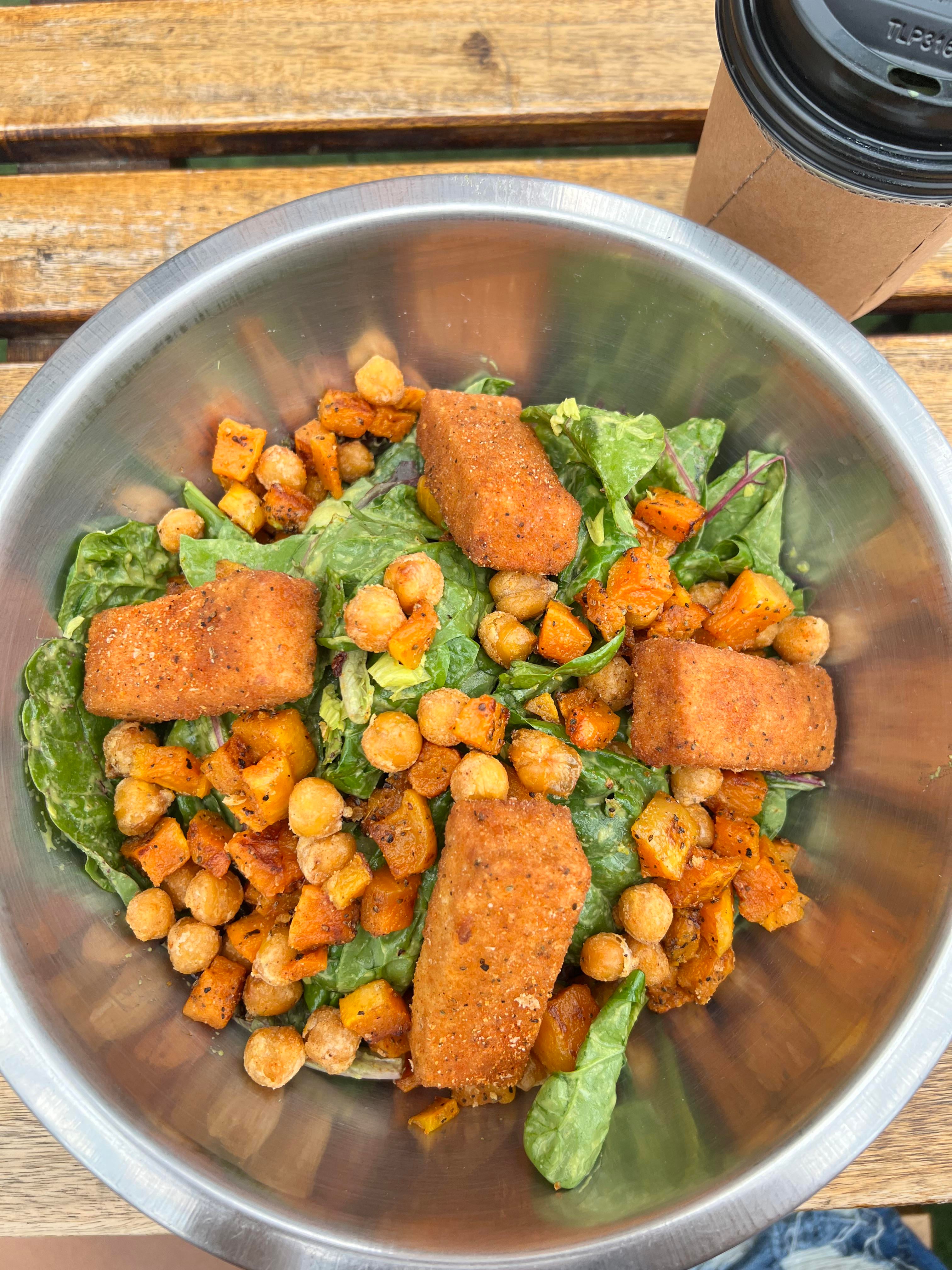 How many calories do you think? My guess is around 500. Description below:Roasted Pumpkin seasonal greens, celery heart, crispy chickpeas, tahini dressingTofu Schnitzel panko crusted tofu by neonatal-kitten Write A CommentYou must be logged in to post a comment.