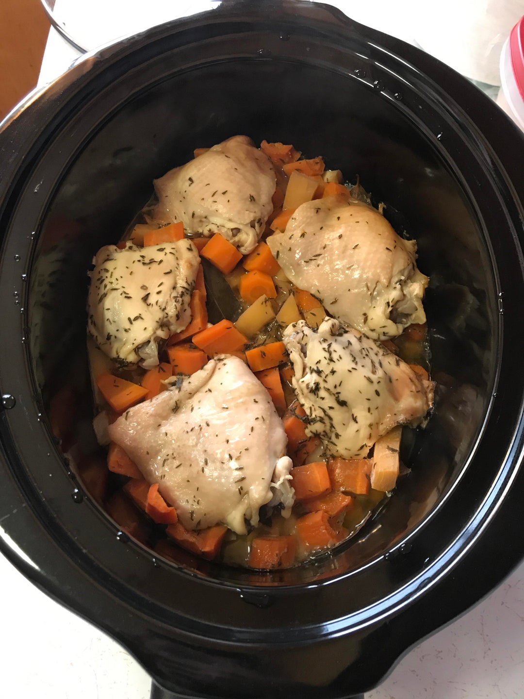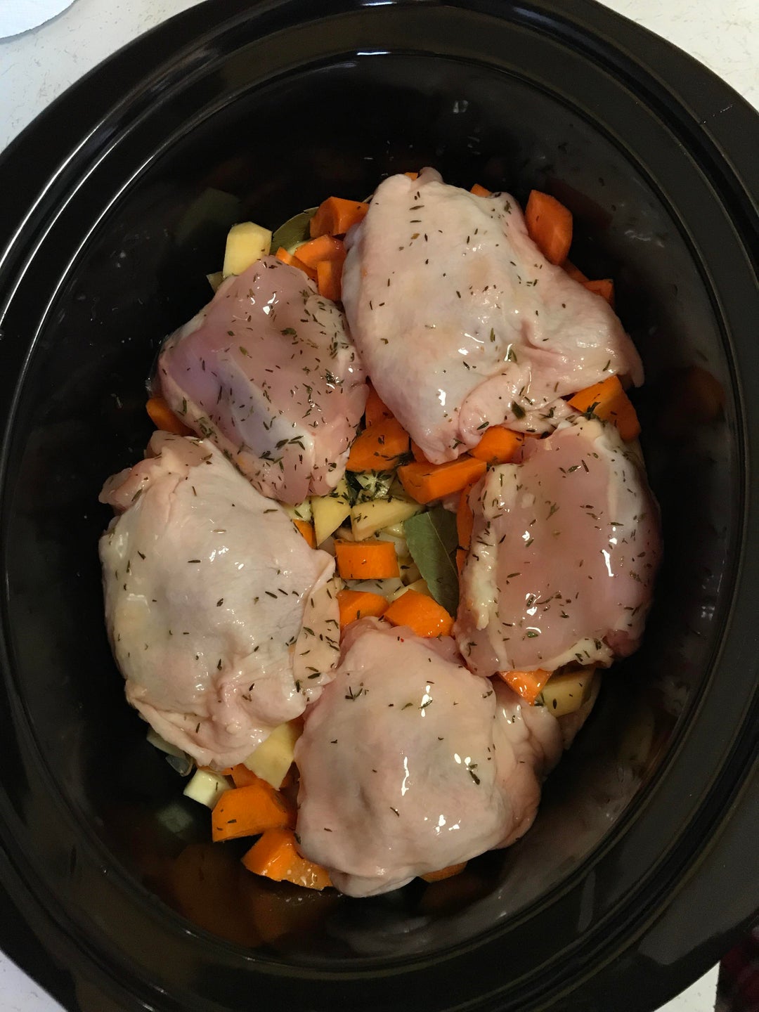 Chicken thighs, parsnips, rutabaga, potatoes, carrots, onion, chicken stock, thyme, bay leaves, S&P.