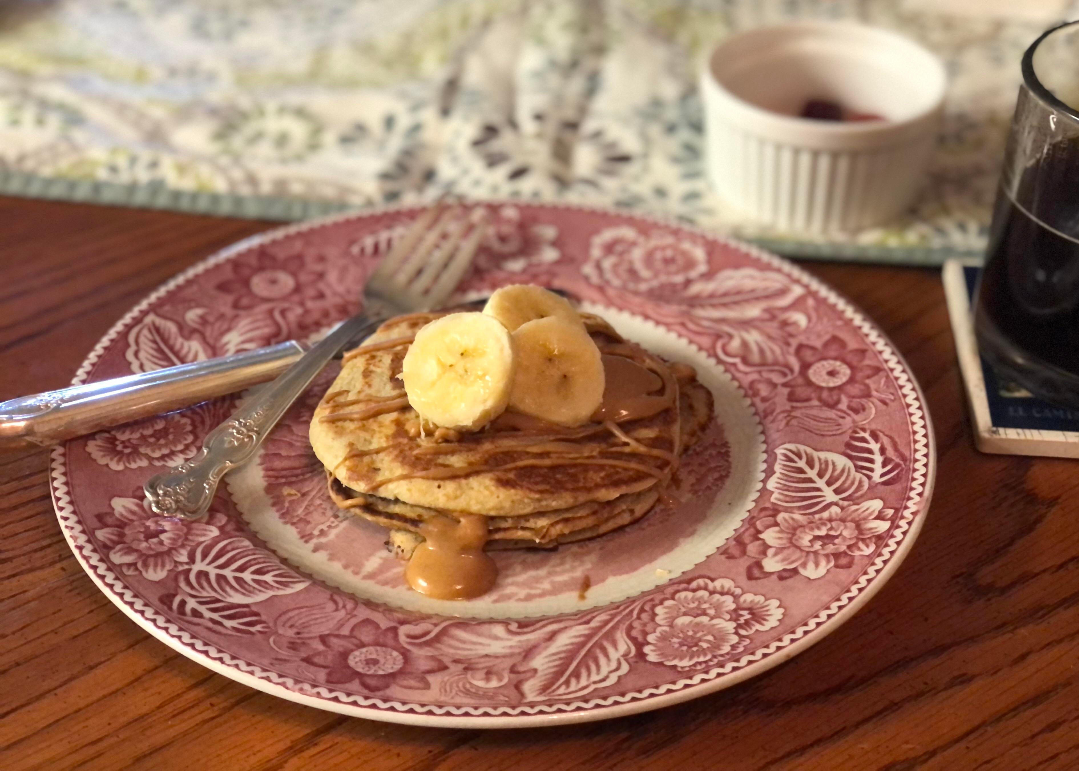 Breakfast. Oatmeal/banana/egg blender pancakes with pbfit. Including vitamins and coffee it came to just over 300 cals.