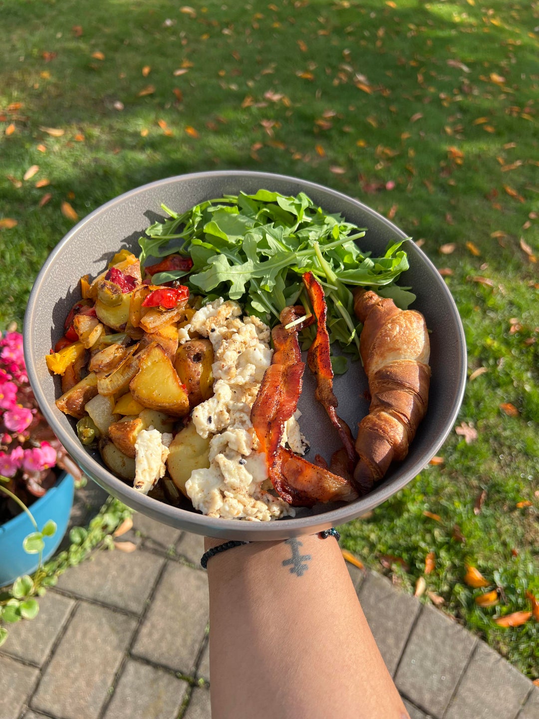 450 cal breakfast- home fries, egg whites, bacon, mini croissant and some arugula ! 🤍 by Chloflee 1 Comment Rock_Successful 3 years ago yummmm loves this fresh breakfastWrite A CommentYou must be logged in to post a comment.