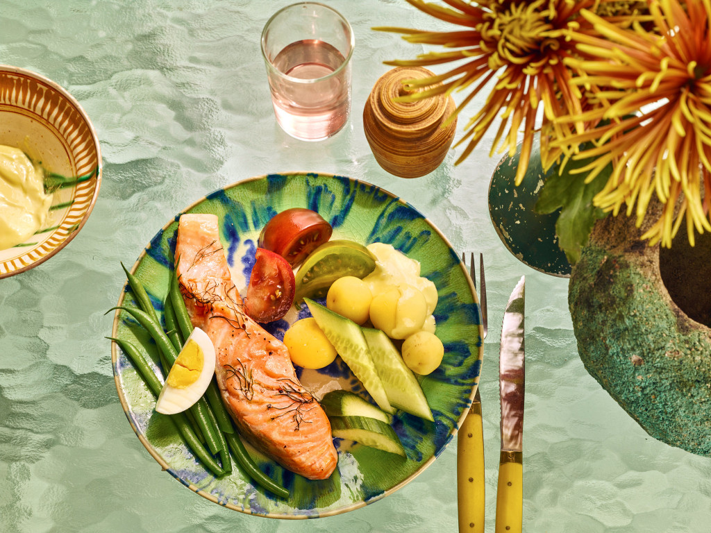 - Wash the fig leaves, and leave them moistened. Place 4 on a baking sheet, and lay the salmon pieces on top. Scatter small pieces of fennel frond on top of the fish, and cover with the remaining fig leaves. Bake in the upper part of the oven until the fish is just cooked through, 10 to 12 minutes, then transfer the salmon to a serving platter immediately. Serve with blanched new potatoes and green beans, tomatoes, cucumber, hard-cooked eggs and aioli.