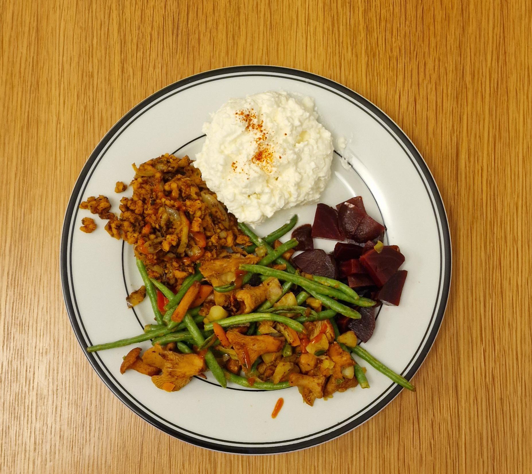 anuragkhetan 3 years ago I couldn’t believe this meal is just 450 cal.– Hüttenkäse 200cal – Gyros Vegan 100cal – Boiled beetroot <50cal – Sauted veggies, beans, and mushroom – 100calAll items were store brought so I calculated using weight. Olive oil would’ve added 50cal more approx.