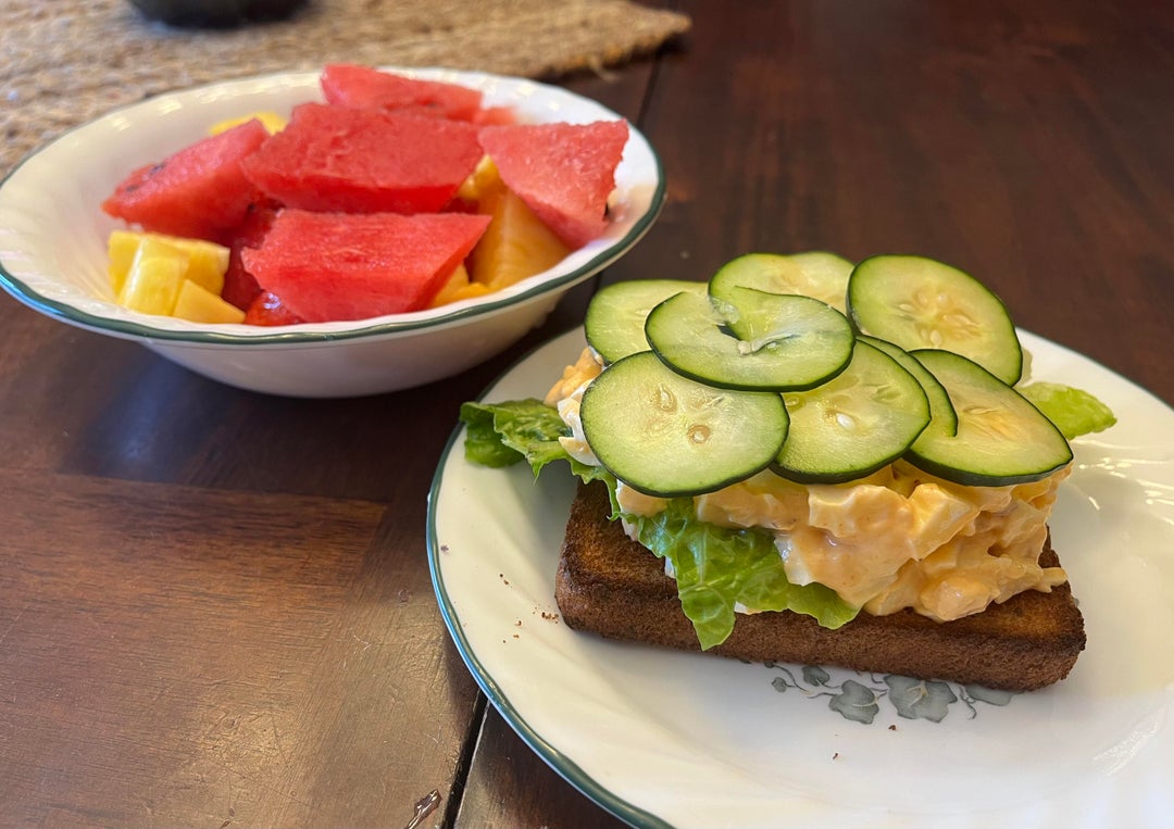 400 calorie lunch: Sriracha egg salad on toast with fresh fruit. (Added S&P, garlic powder and paprika to egg salad for flavor) by gourd_lord_ascendant Write A CommentYou must be logged in to post a comment.