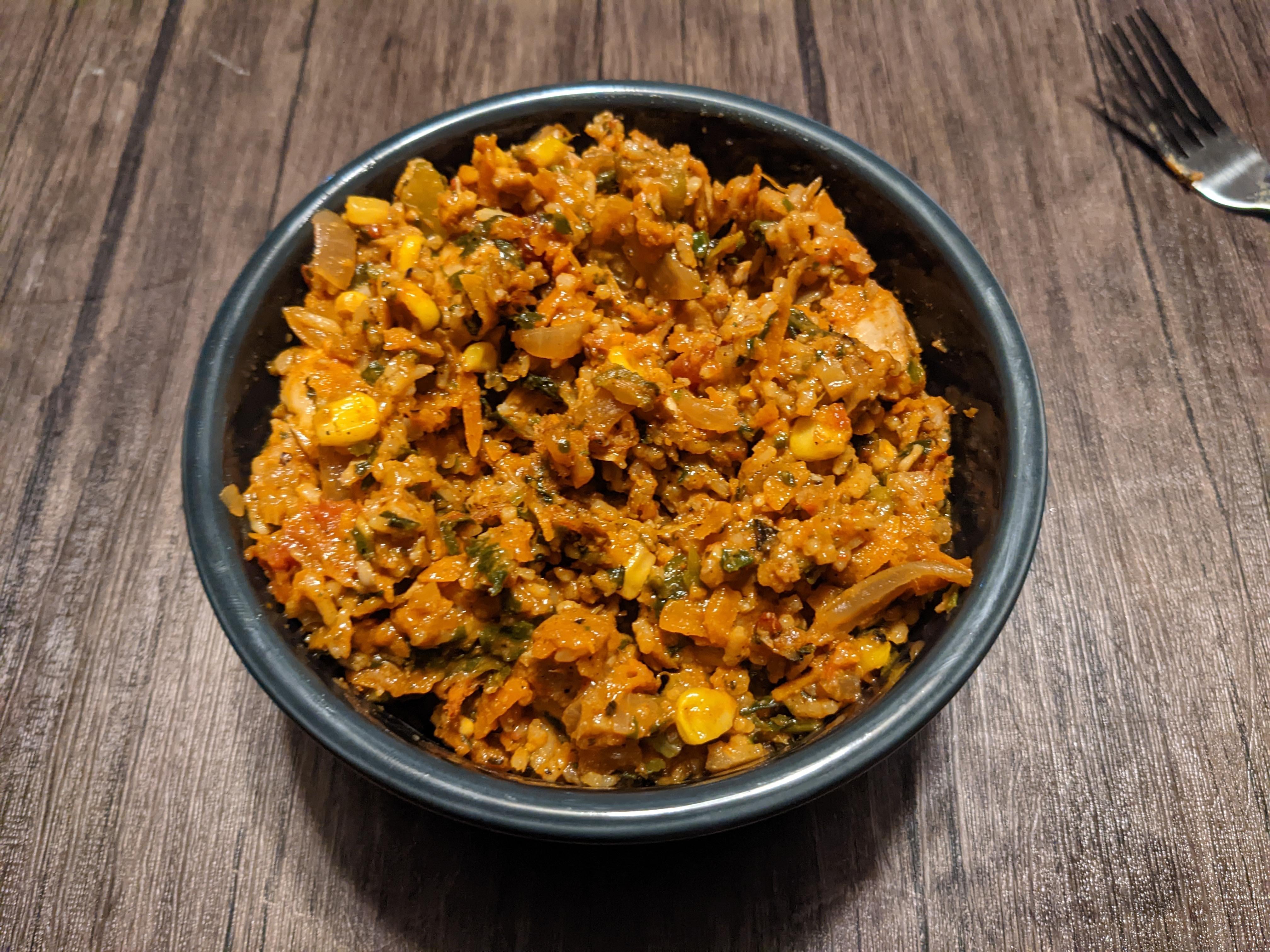 Took 3g schmaltz and browned 191g of white onion small dice until tender, added 220g carrots and 106g celery and cooked until they released a decent amount of liquids. Removed and added 6g schmaltz and browned cubed and stripped boneless skinless chicken breast, 500g, each side, added uncooked jasmine rice, 142 g and lightly toasted, then added 141 g spinach, 147 g riced cauliflower, 139 g frozen corn kernels, 408g canned fire roasted tomatos, and the previously removed veggies back into pot along with 2 cups of water, and waited for it to reach a boil then lowered to a simmer, stirring occasionally over 20 minutes until thickened. I added 10g of micro-planed Parm and some red wine vinegar to taste.